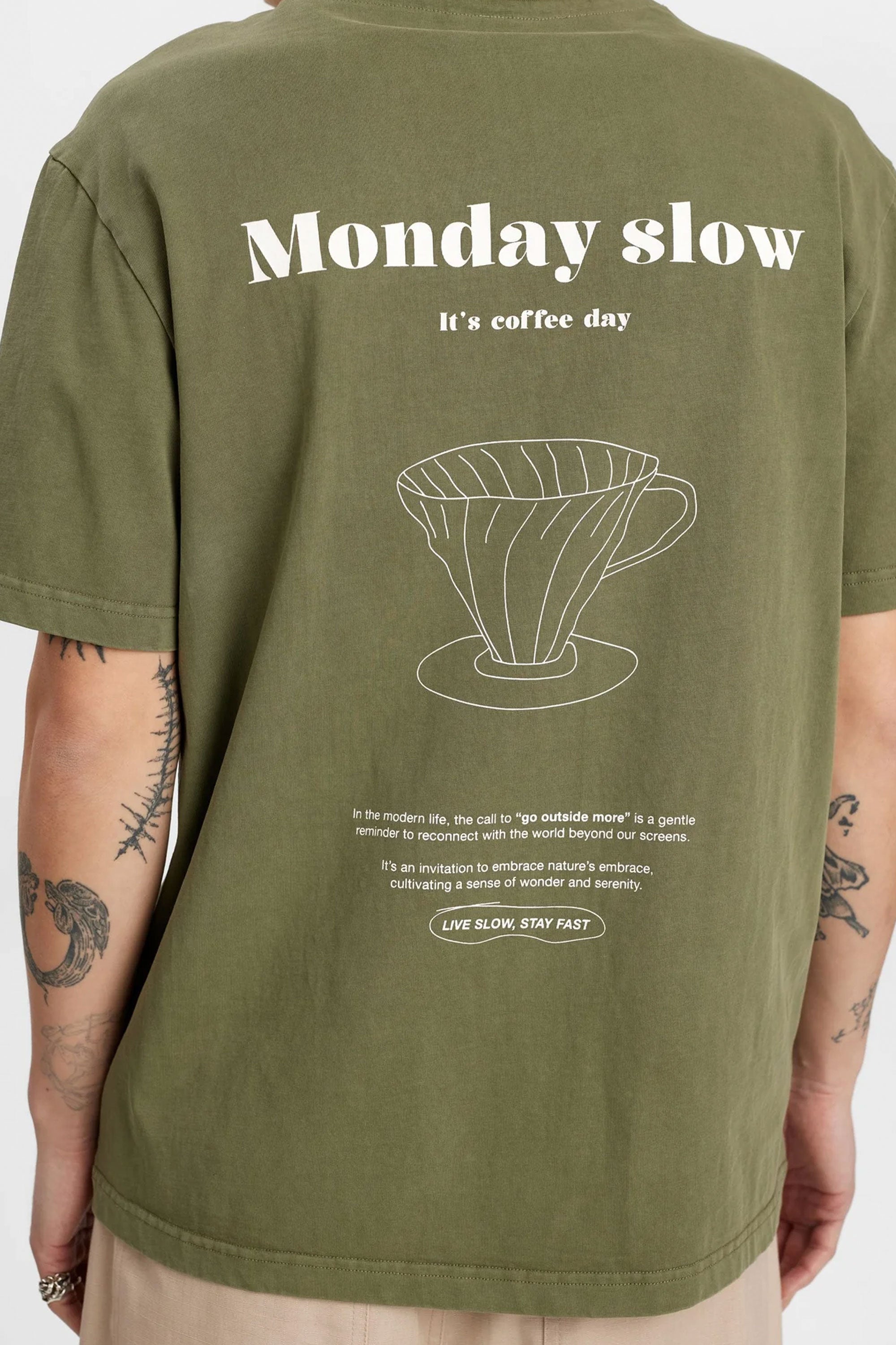 Start your week right with this relaxed-fit tee in earthy olive tones. Featuring the "Monday Slow" message and a charming coffee dripper illustration, it’s a gentle nudge to slow down, sip your brew, and reconnect with the simple things.