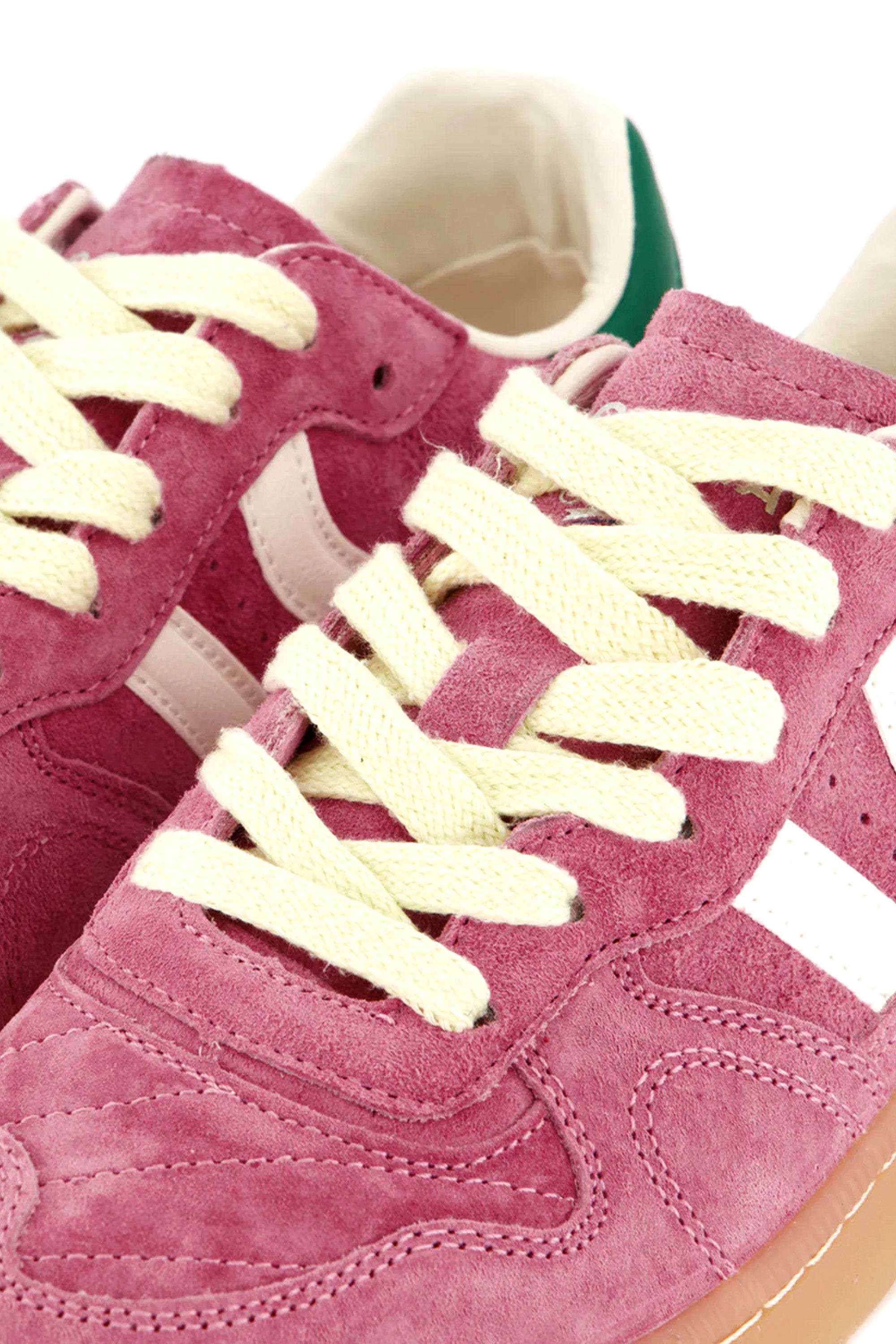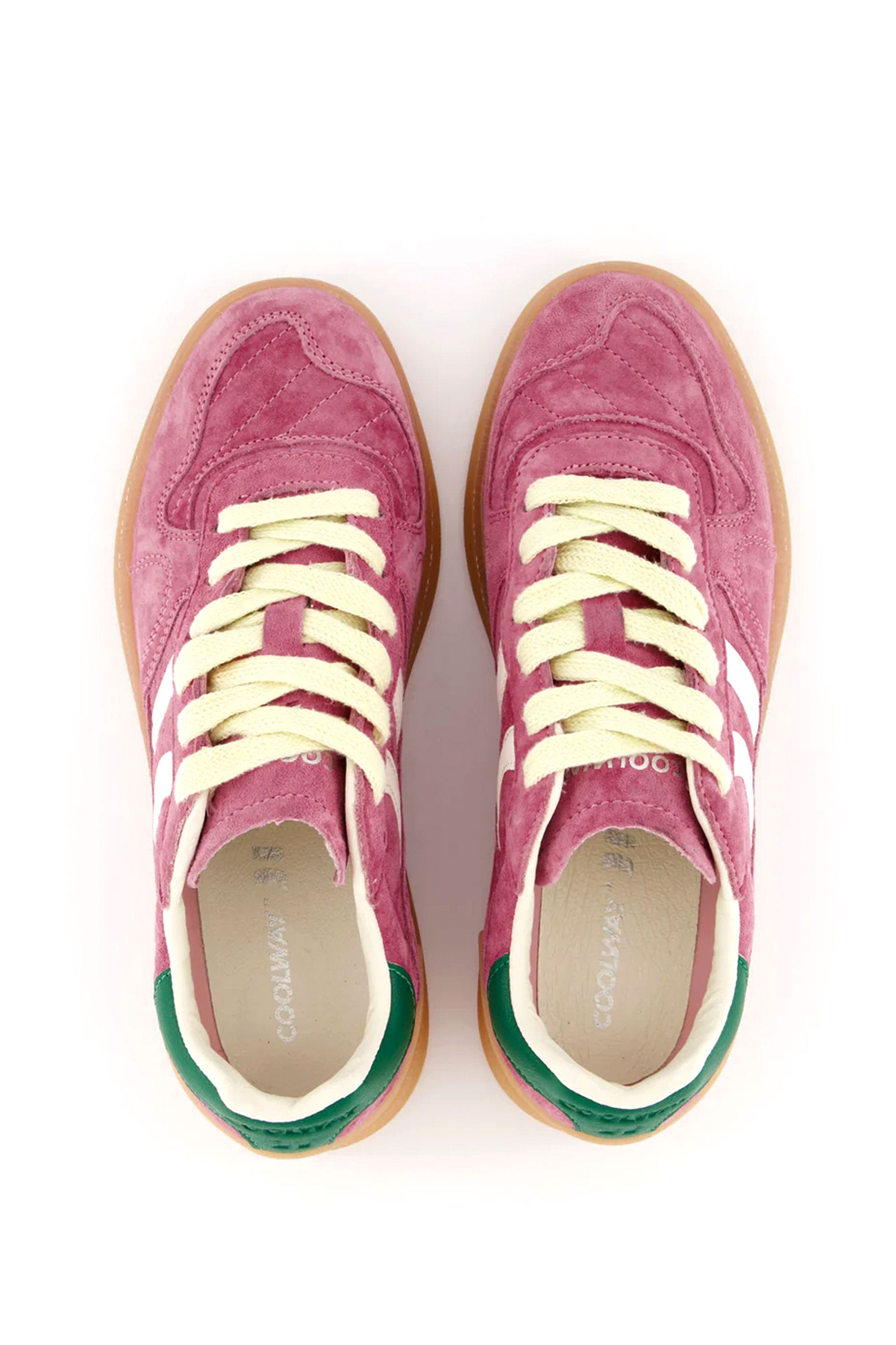 Split leather sneaker with contrasting colour details. Leather tongue and preformed tongue with figured cushioning. Leather lining. Interchangeable two-tone flat cotton laces. Slightly padded collar. Front is reinforced with stitching. Flexible rubber outsole for durability and grip. Features the model name ‘GOAL’ on the side in old gold.