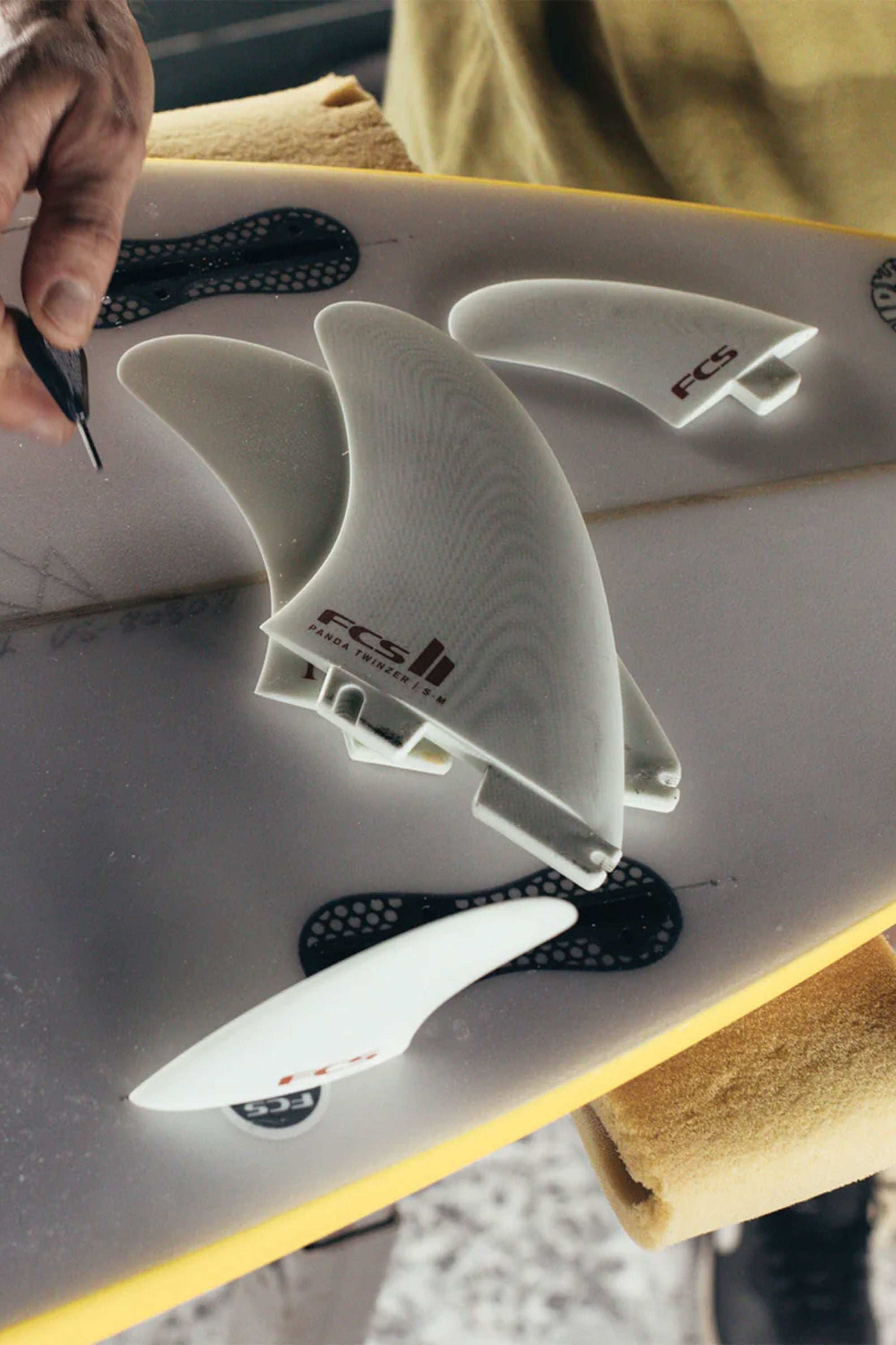 Designed by Blake Peters for his Panda Shiiitake and Shiiitake HP Twinzer models. The front twin fin is neutral and well balanced, categorising it as an all-round twin fin with equal parts drive, manoeuvrability and hold. The side fins sit in the S-M size category, however the addition of the two forward stabiliser fins increases the overall surface area of the set, adding even more drive and control.