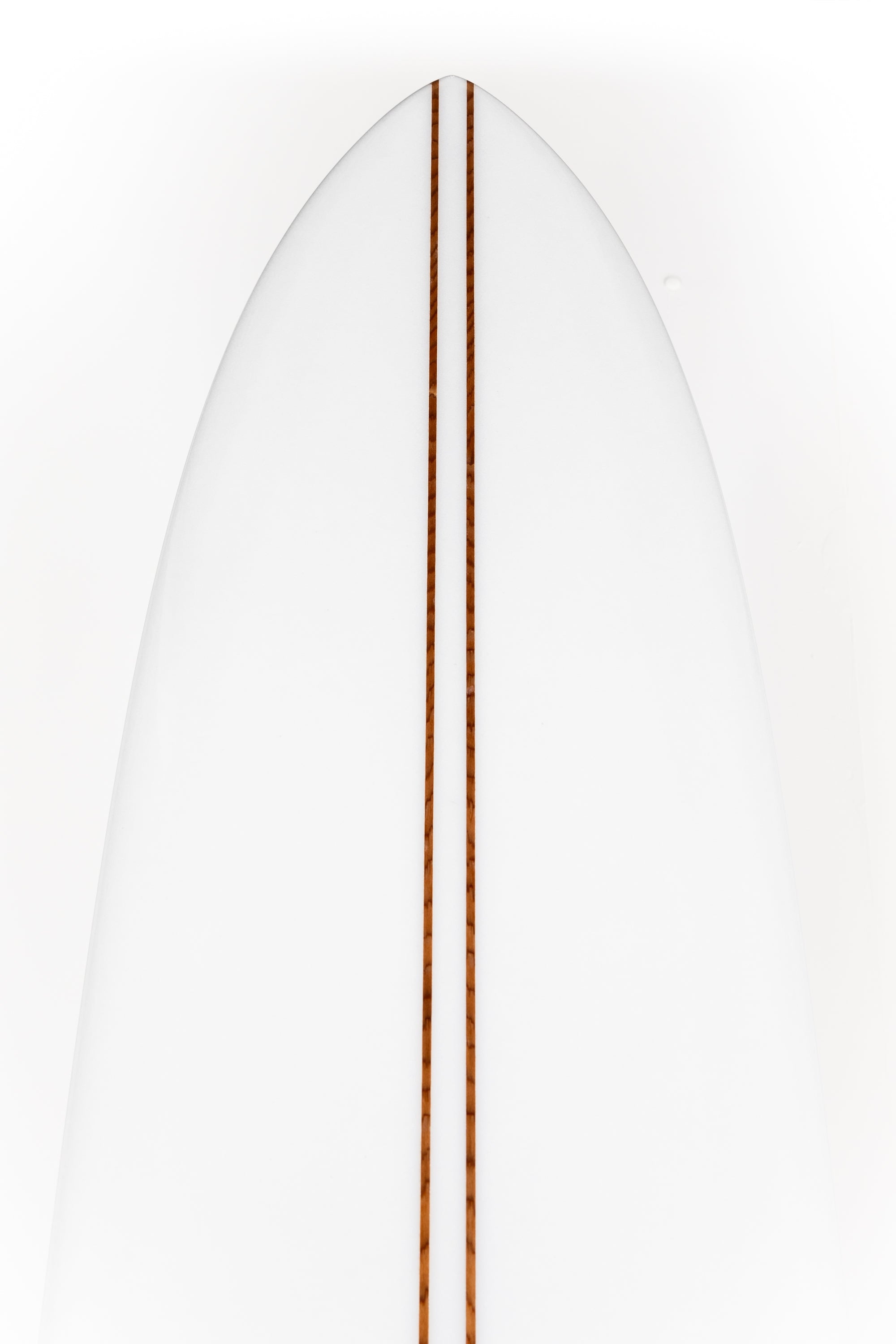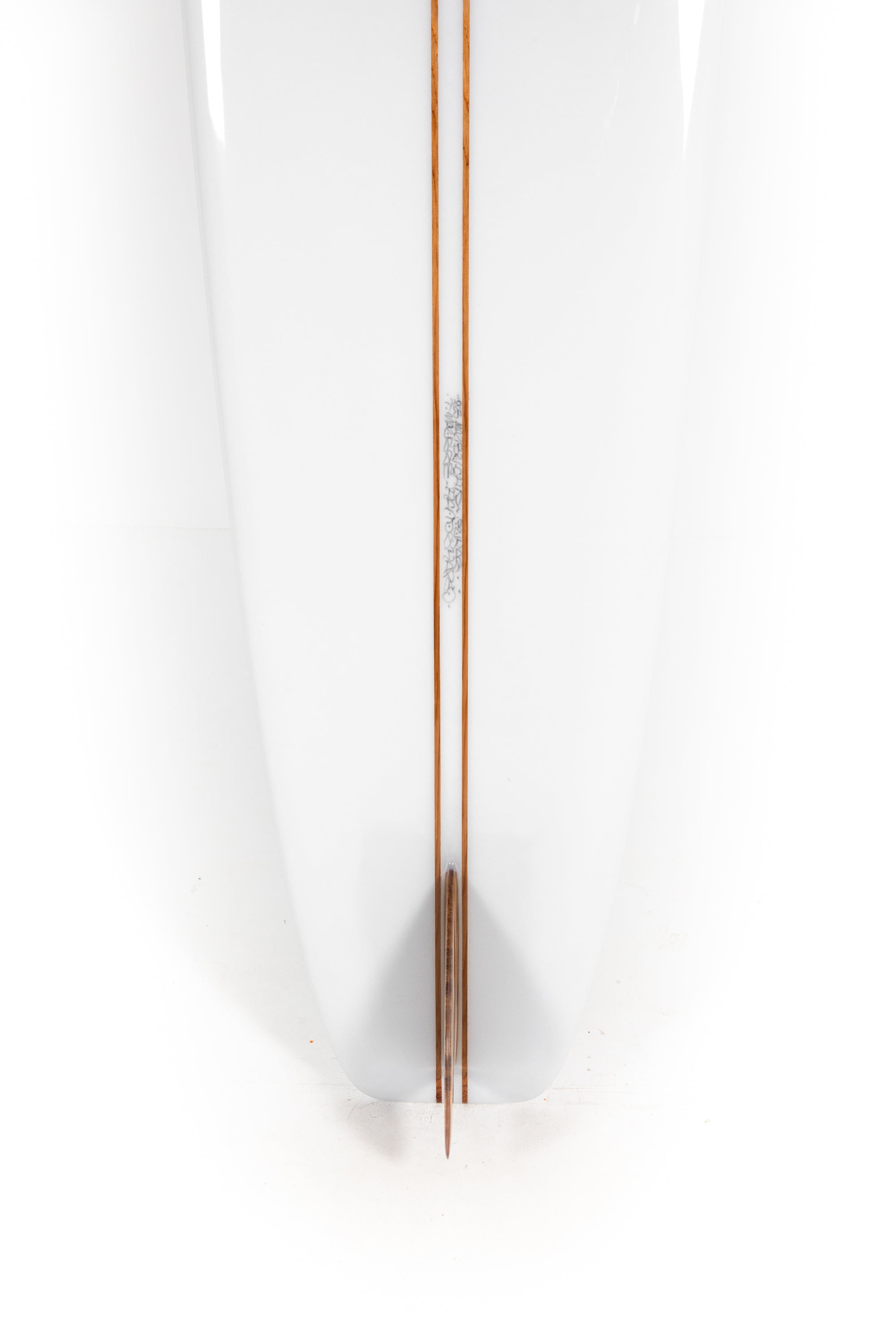 This is a clear 9’9” Malibu Chip with double stringer, polish and glass on fin built entirely by Tristan at his atelier in Anglet, France. The rails and the tail are a bit thicker and the fin straighter and with less rake than the other Malibu Chips from this collection of 3 that Tristan has built exclusively for us. All this together makes the board more cruisy and it is based mostly on the third board brought to France in 1958.