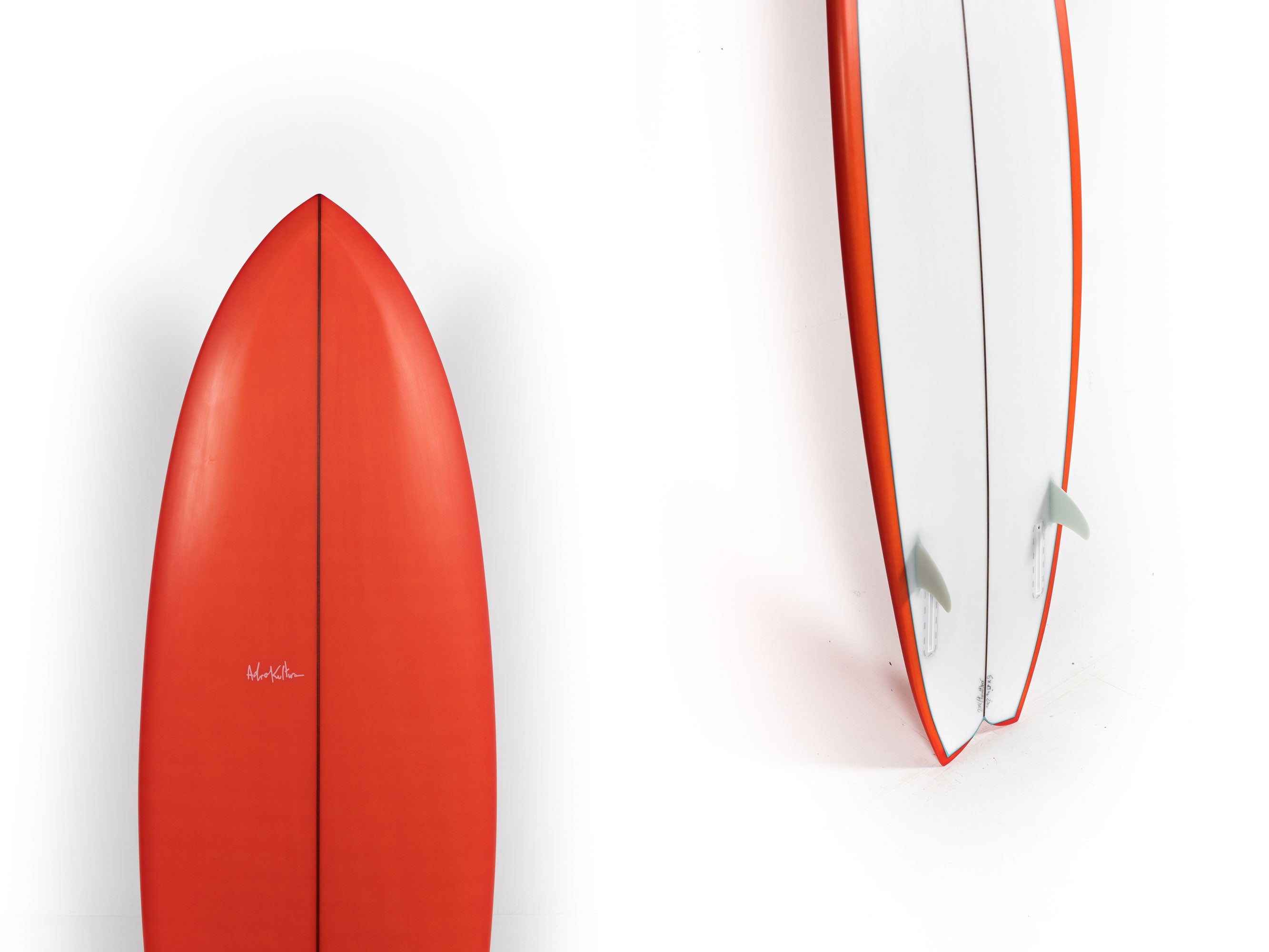 The Twinzer is a standard twinny with two smaller fins sitting just forward and towards the rail of each larger fin. And for these particular batch, Adrian has glassed them with 4oz fiberglass in the bottom and two layers of 4oz fiberglass on top. They feel light and sweet, with the magic of a shape that has been handshaped from start to finish.