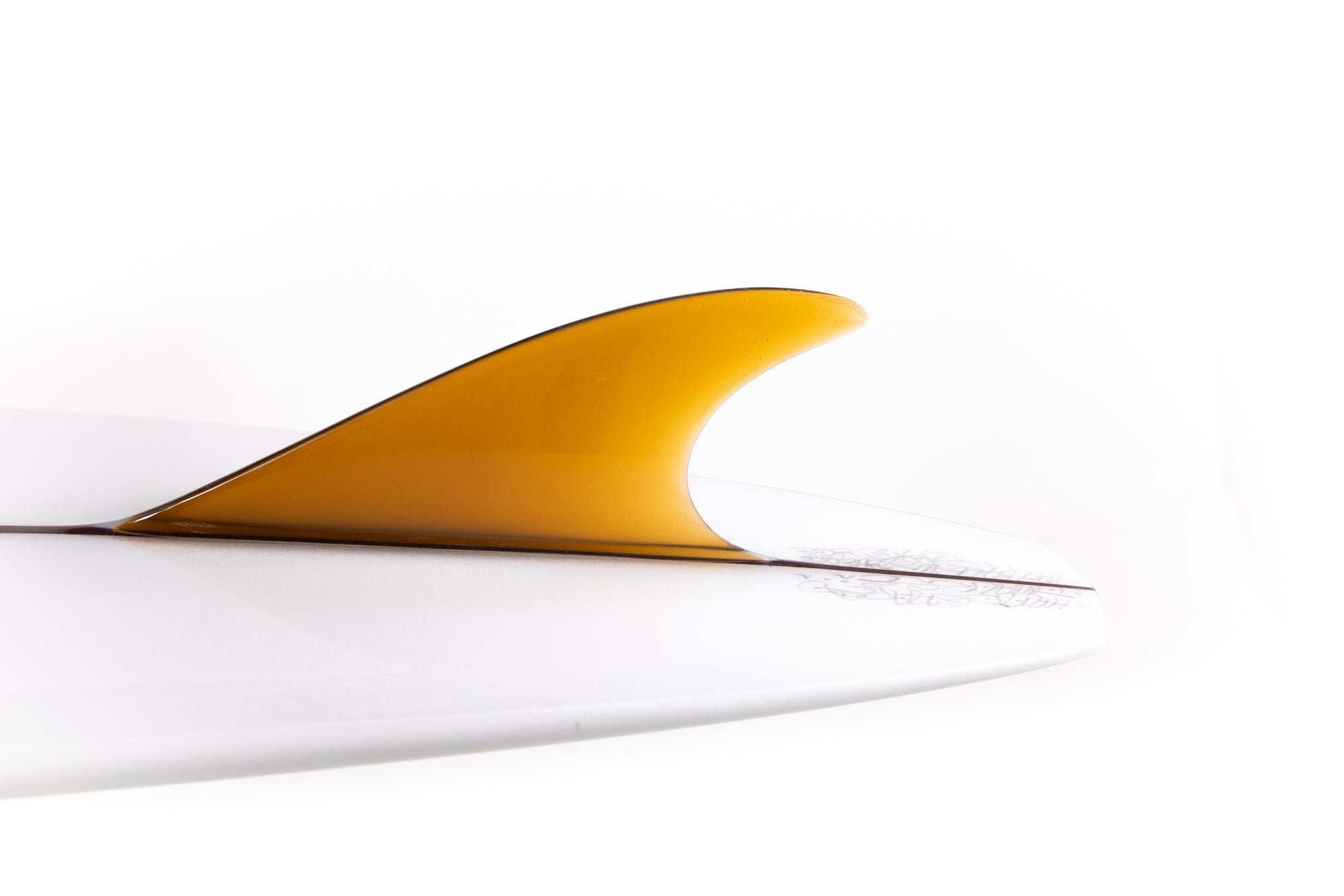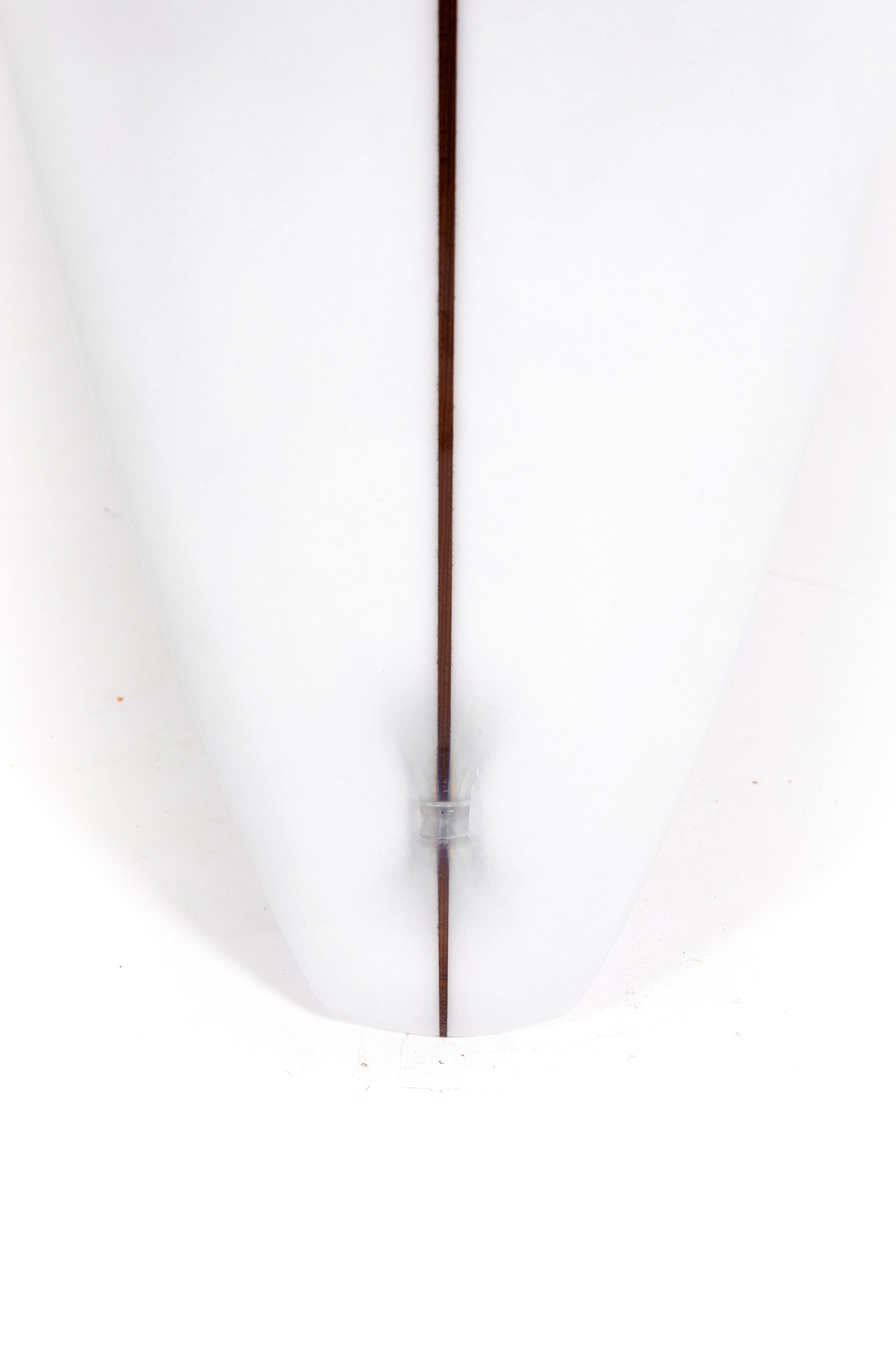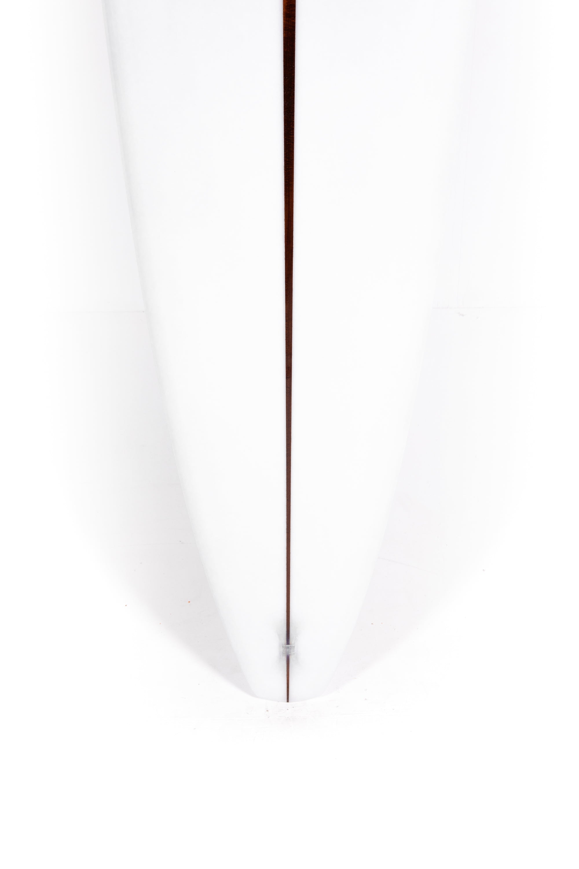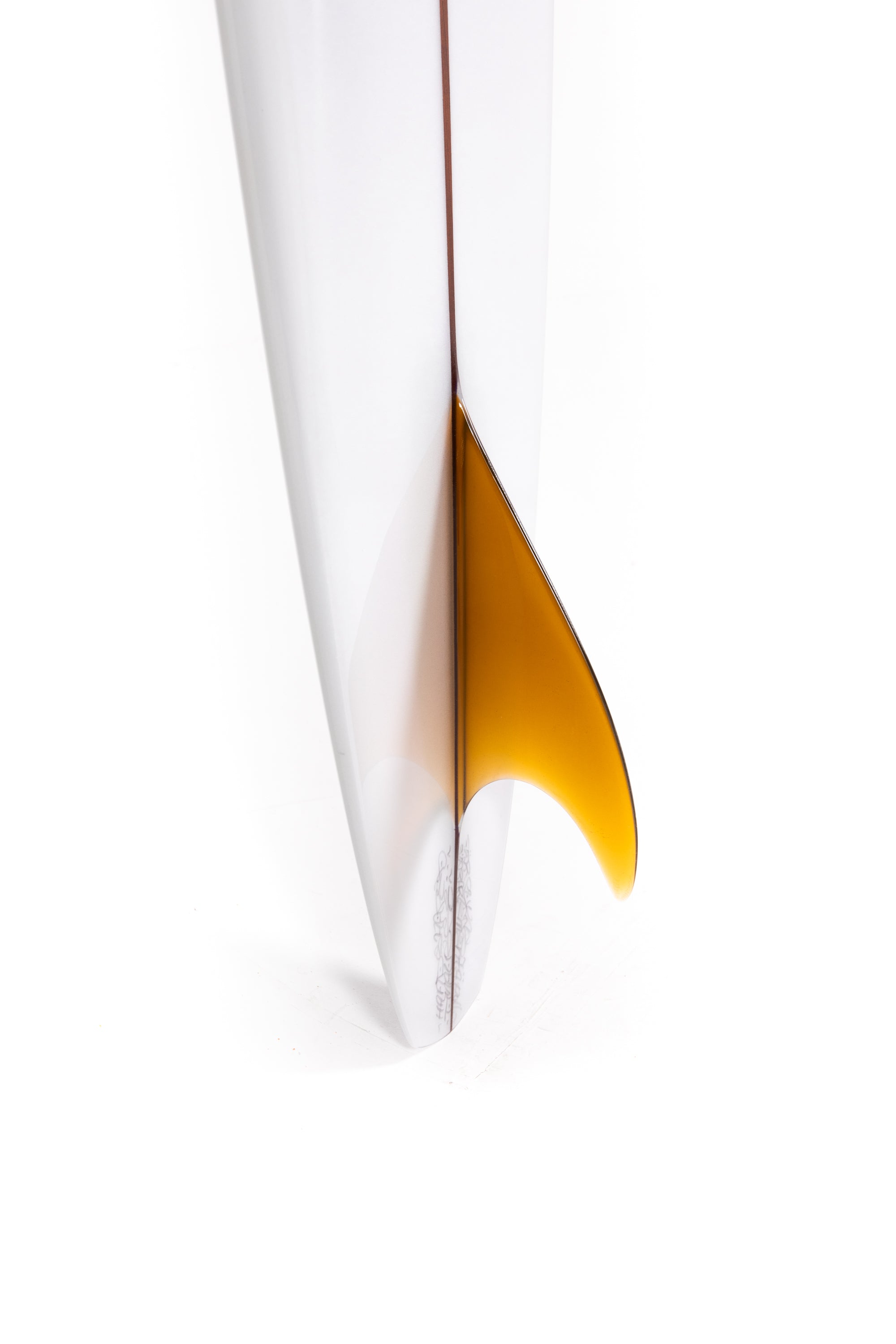 “The fin is a test and I designed it with the help of my good friend Jean Penninck during a late night at the factory, for that special board we got inspired between the Tom Blake's skeg or the Pat Curren's gun fins but with a touch of "Greenough" and a bit of Wayne Lynch's keel fin. The 6 1/2 inches deep will hold enough that super narrow tail and drag less water on the take off, but we add a super wide base to lock the board during the turns. The first 2 inches of the fin is flex but quickly become wide so might stay away from vibrations. The front part of the fin is thick and round. Heavy glass job of course.”