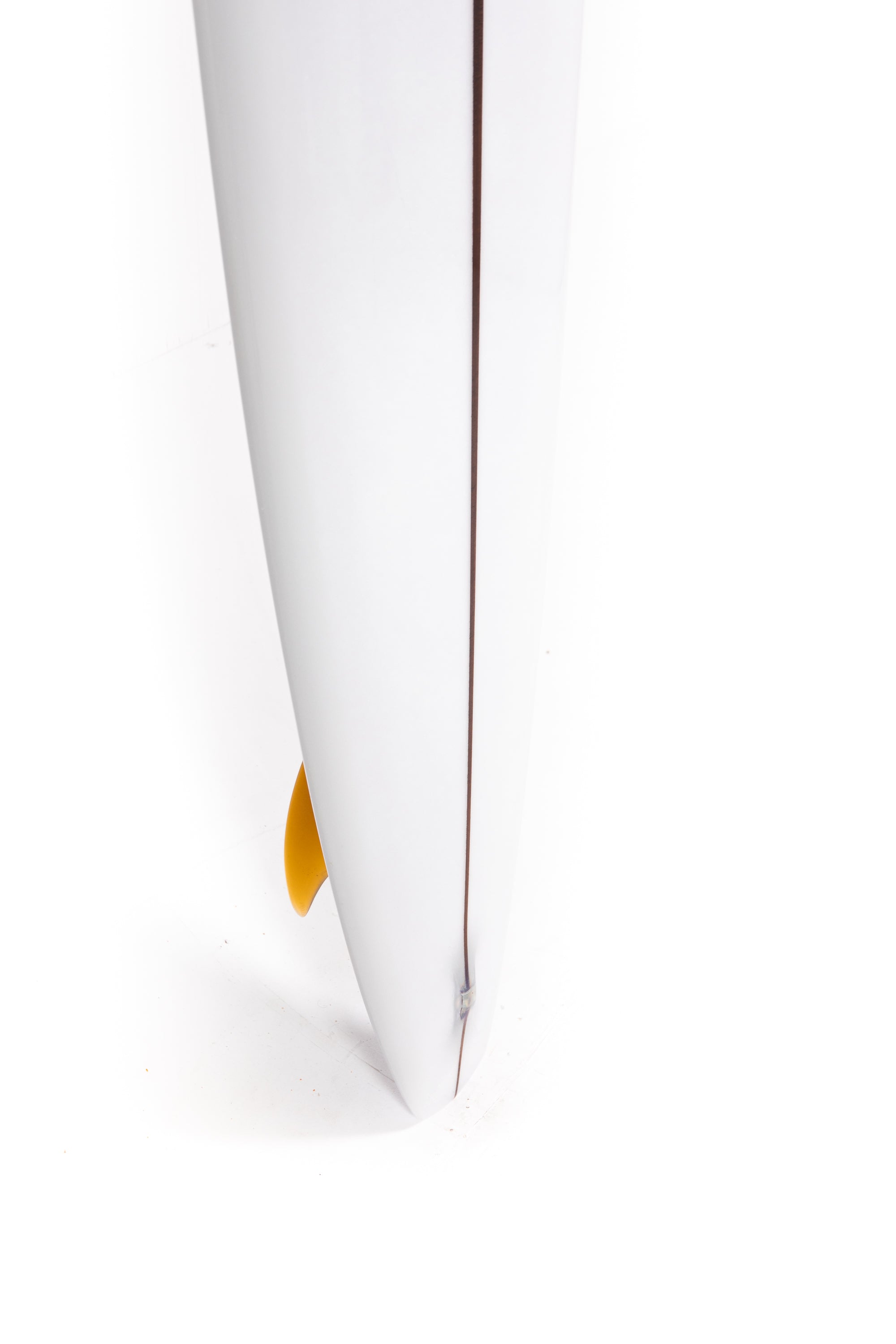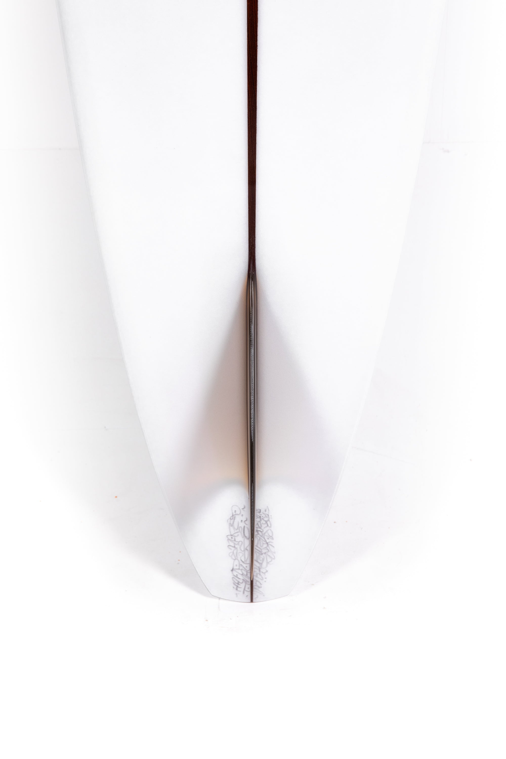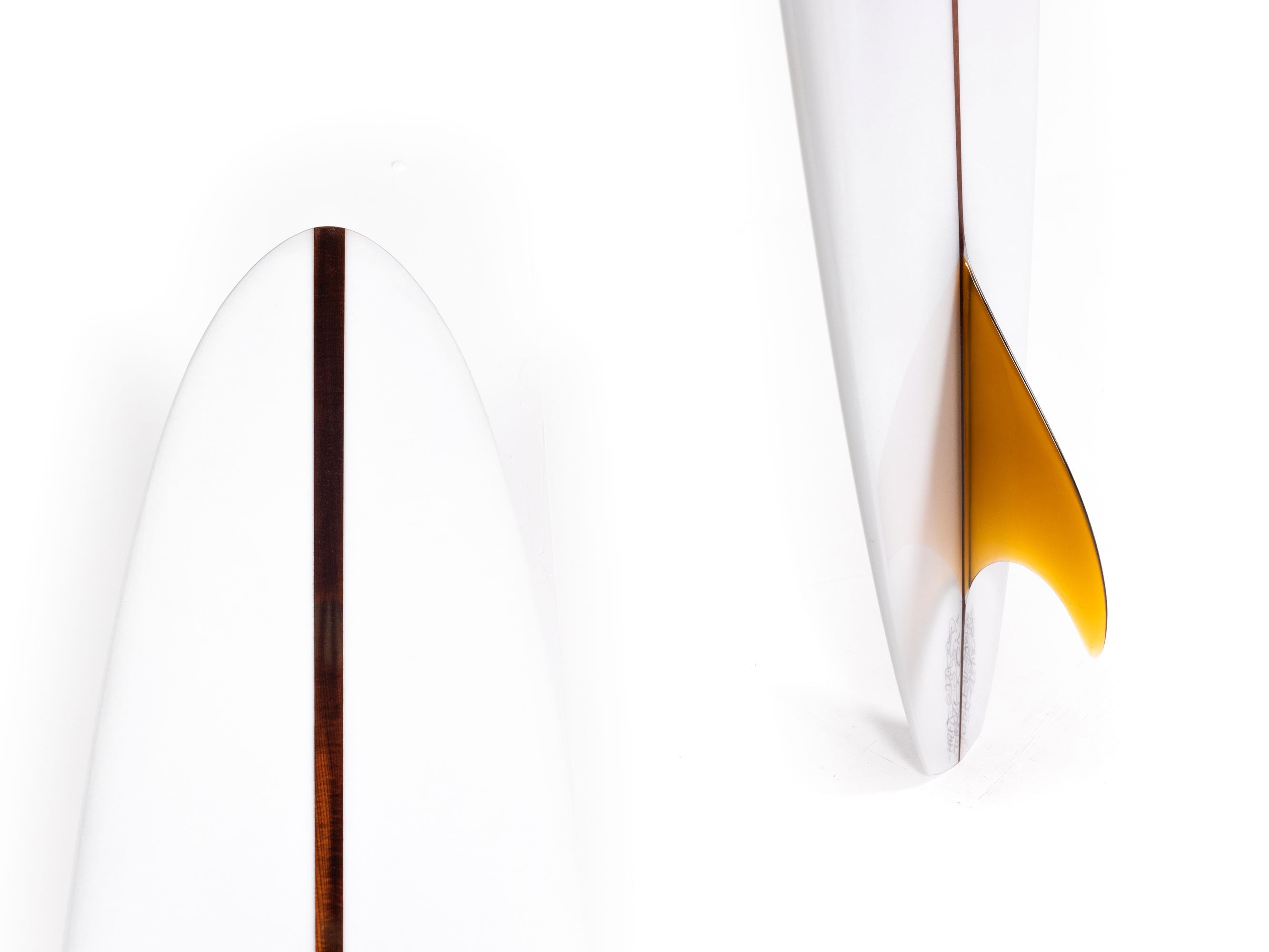 “The fin is a test and I designed it with the help of my good friend Jean Penninck during a late night at the factory, for that special board we got inspired between the Tom Blake's skeg or the Pat Curren's gun fins but with a touch of "Greenough" and a bit of Wayne Lynch's keel fin. The 6 1/2 inches deep will hold enough that super narrow tail and drag less water on the take off, but we add a super wide base to lock the board during the turns. The first 2 inches of the fin is flex but quickly become wide so might stay away from vibrations. The front part of the fin is thick and round. Heavy glass job of course.”