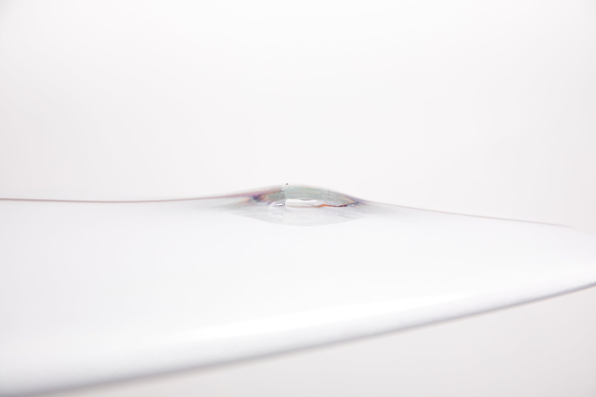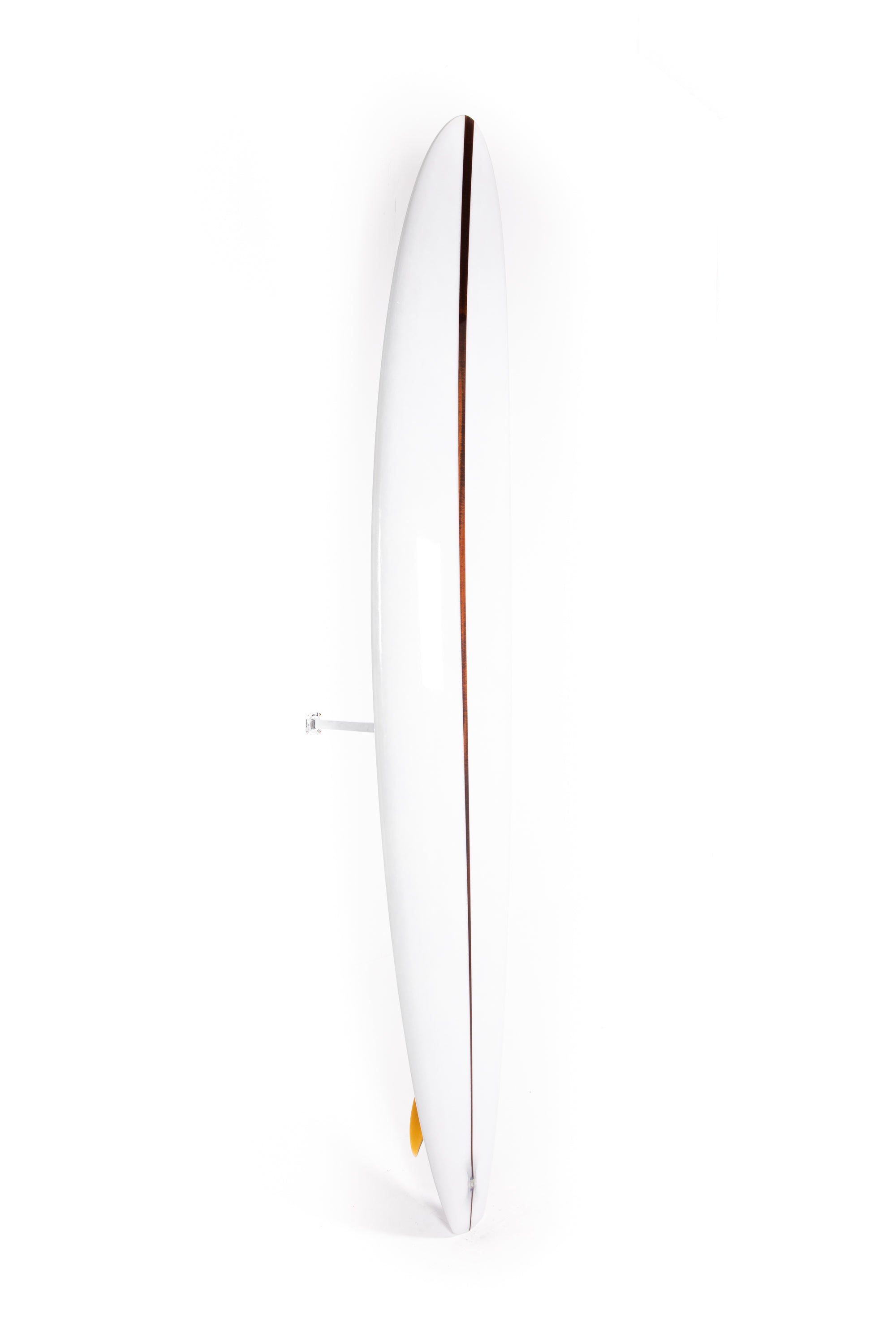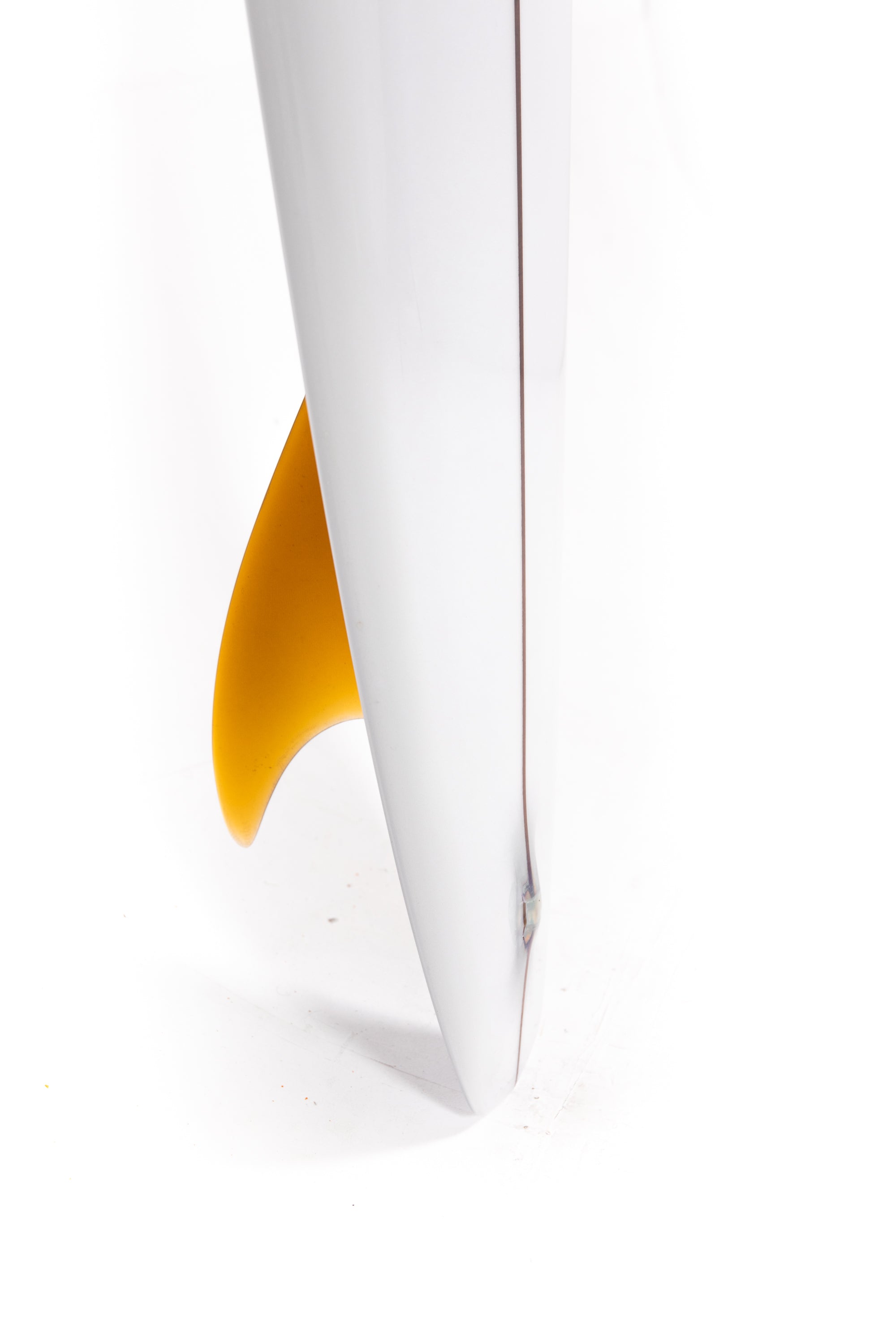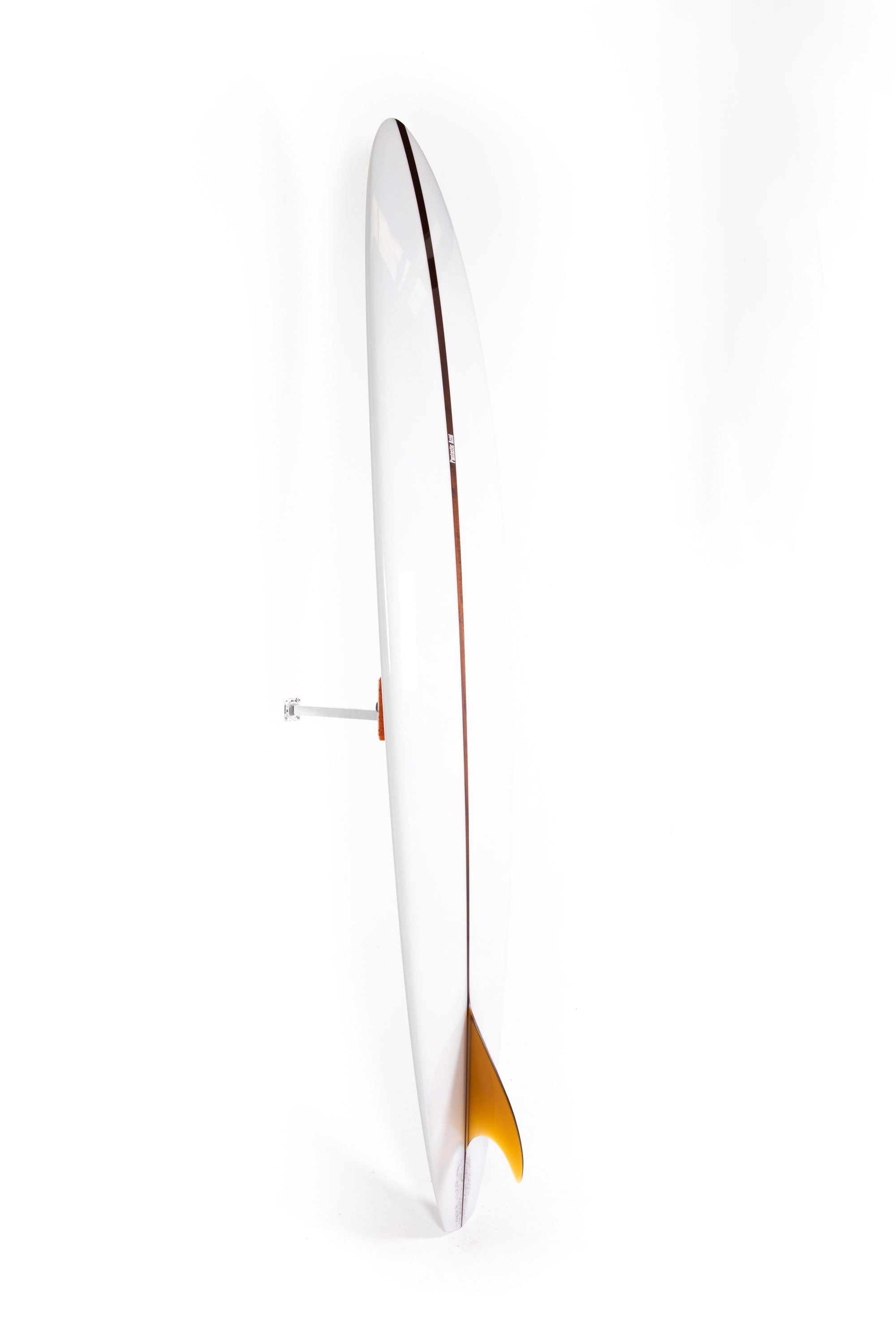 “The fin is a test and I designed it with the help of my good friend Jean Penninck during a late night at the factory, for that special board we got inspired between the Tom Blake's skeg or the Pat Curren's gun fins but with a touch of "Greenough" and a bit of Wayne Lynch's keel fin. The 6 1/2 inches deep will hold enough that super narrow tail and drag less water on the take off, but we add a super wide base to lock the board during the turns. The first 2 inches of the fin is flex but quickly become wide so might stay away from vibrations. The front part of the fin is thick and round. Heavy glass job of course.”