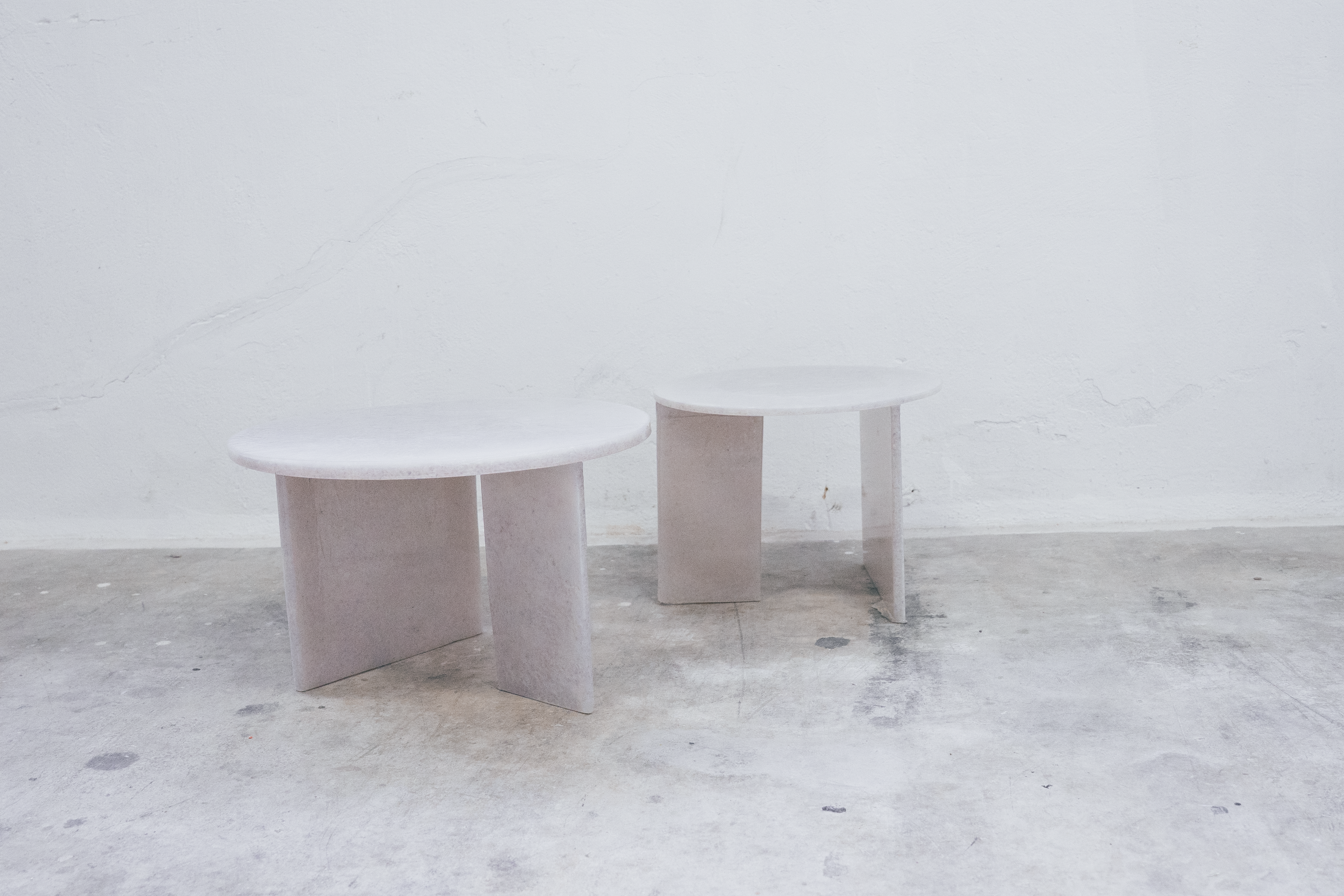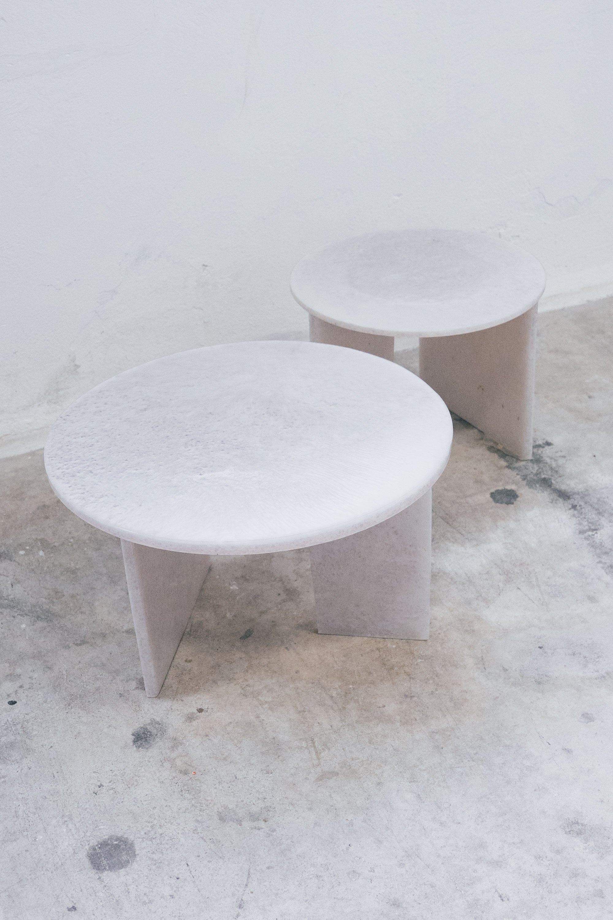 Coffee table: A 50cm diameter countertop with two separate legs placed at right angles, measuring 30 x 30 cm and 30 x 15 cm respectively. The legs are glued to the countertop using the same manual technique used to glue fixed fins to surfboards.