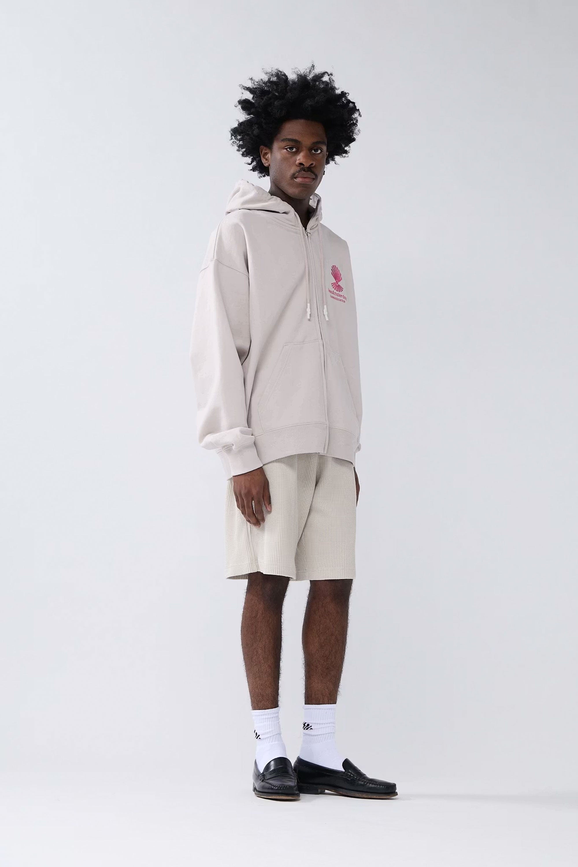 Hooded zipper sweater, cut to a relaxed unisex fit. Detailed with a seasonal New Amsterdam logo embroidery on the front and back. This hoodie is made out of a heavyweight 455 GSM garment-dyed cotton.
