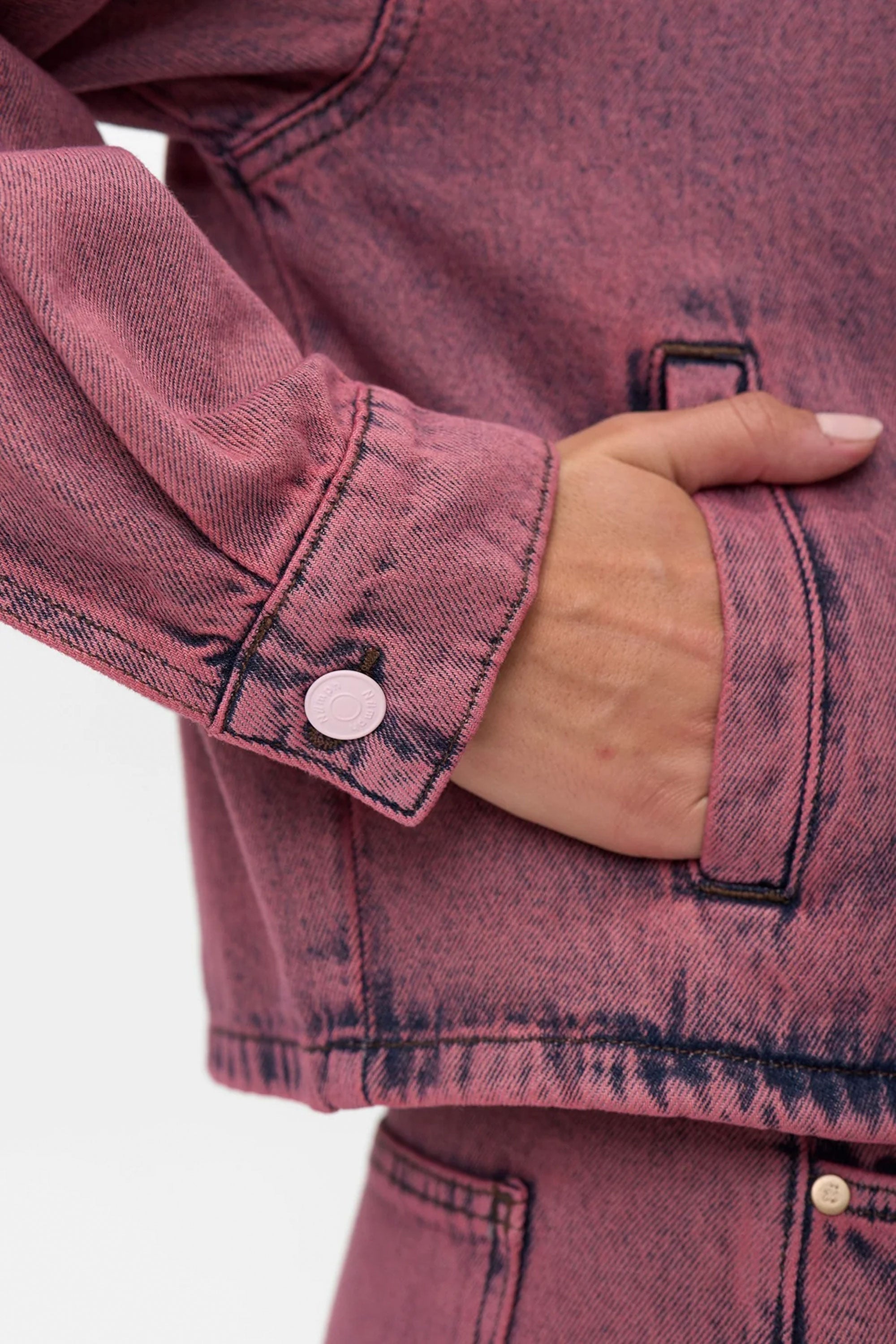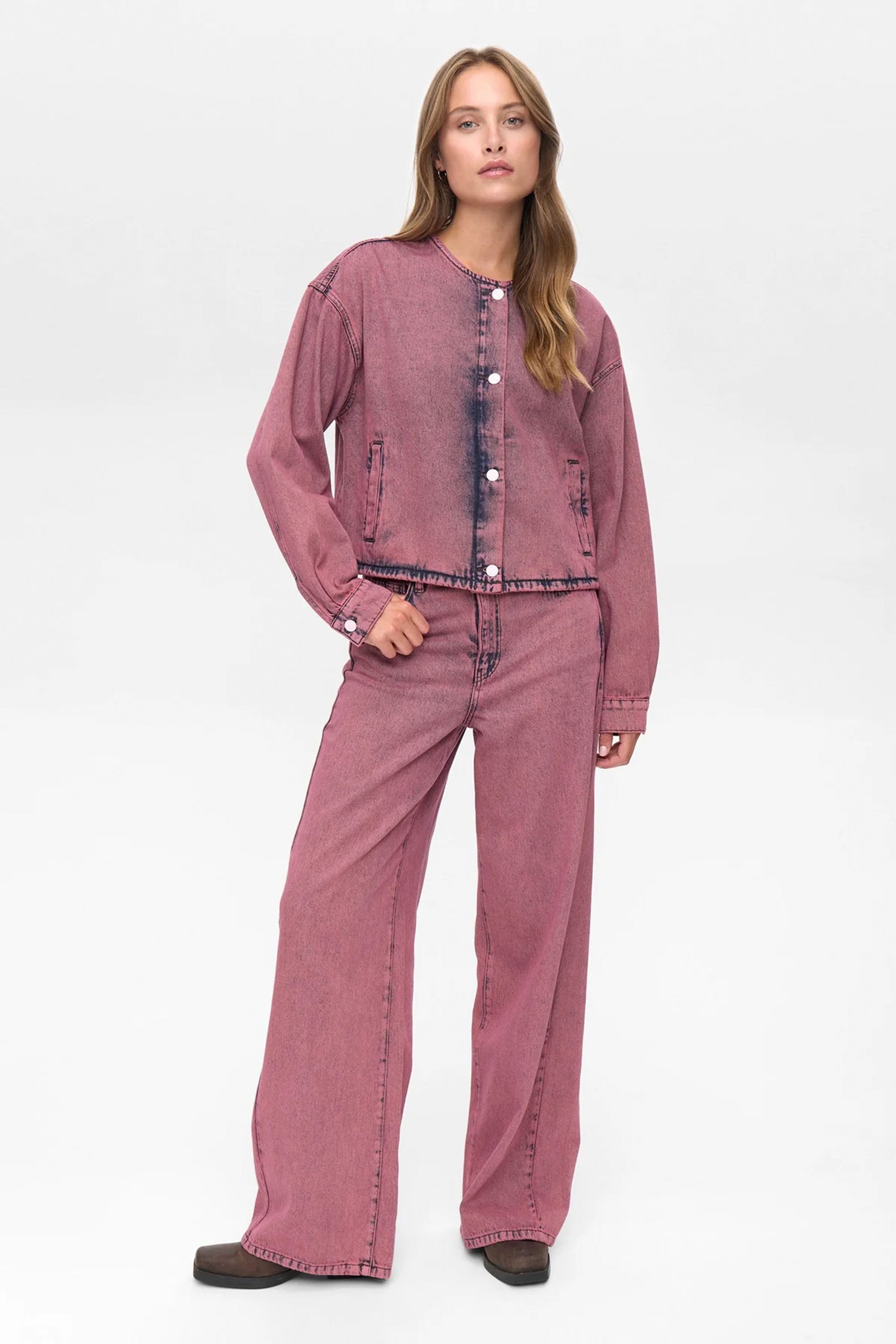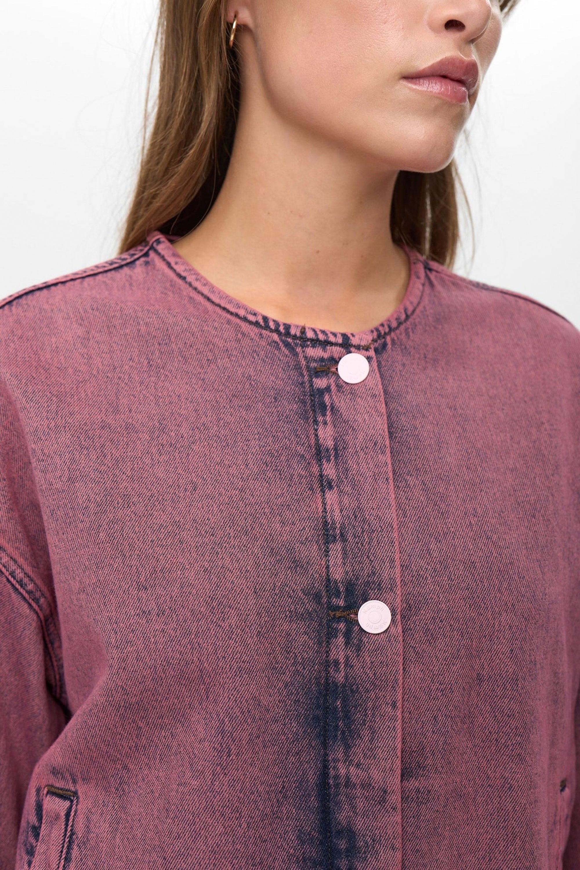 This jacket brings effortless cool to your rotation—light pink rose wash, classic button front with cuffs, and a scoop neckline that modernizes the silhouette. A soft vintage feel that layers fluidly and adds softness to structured looks.