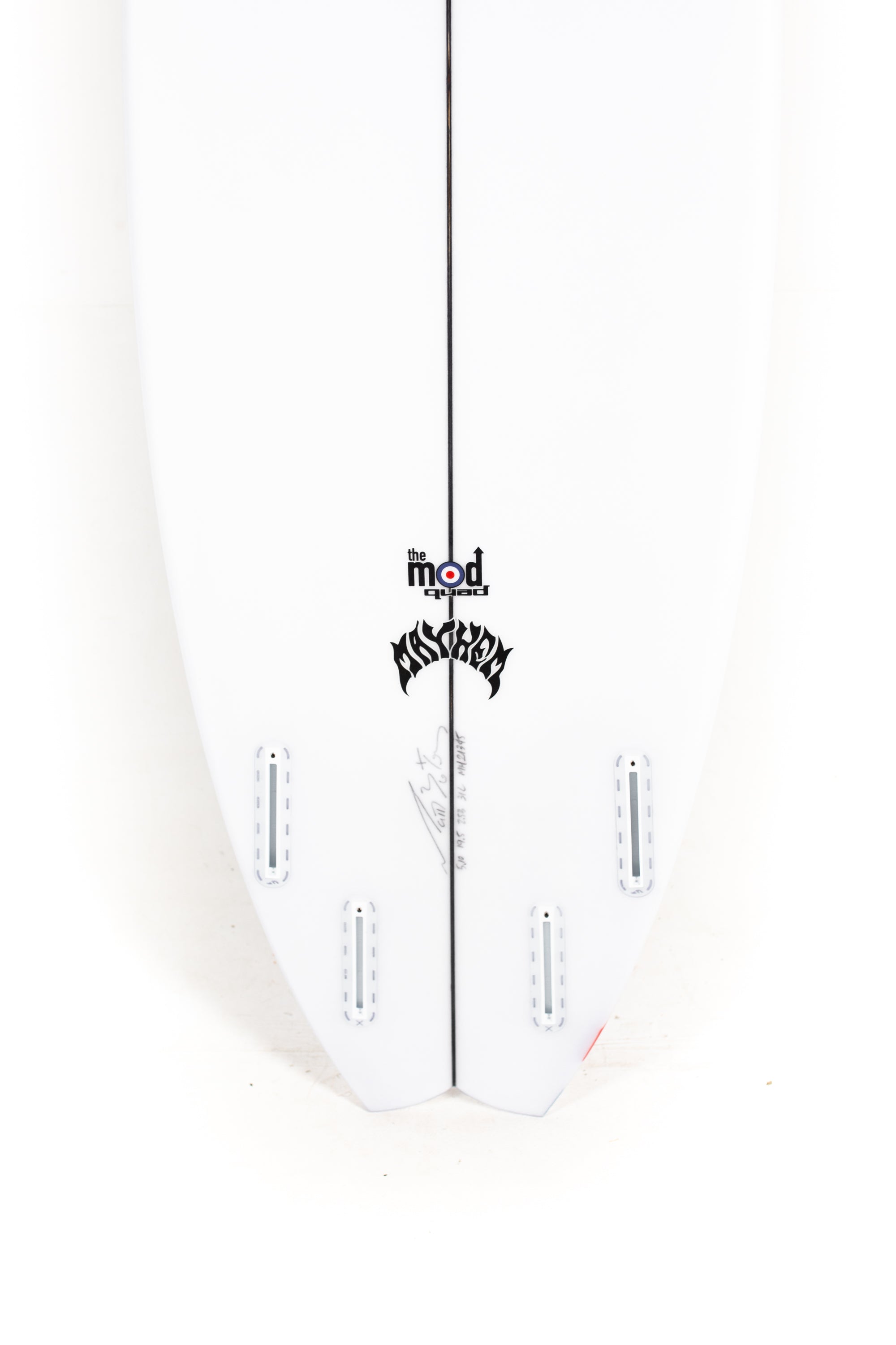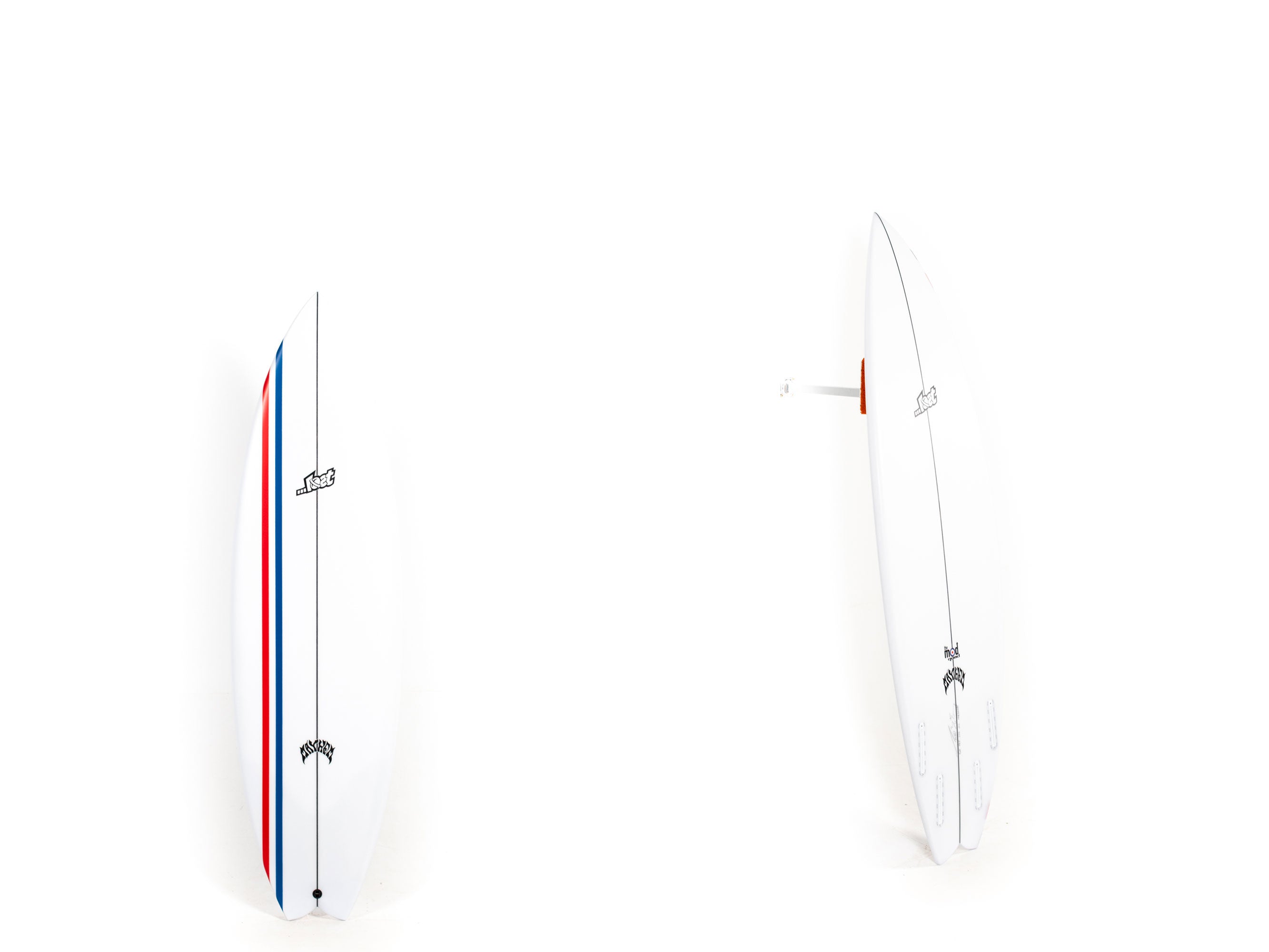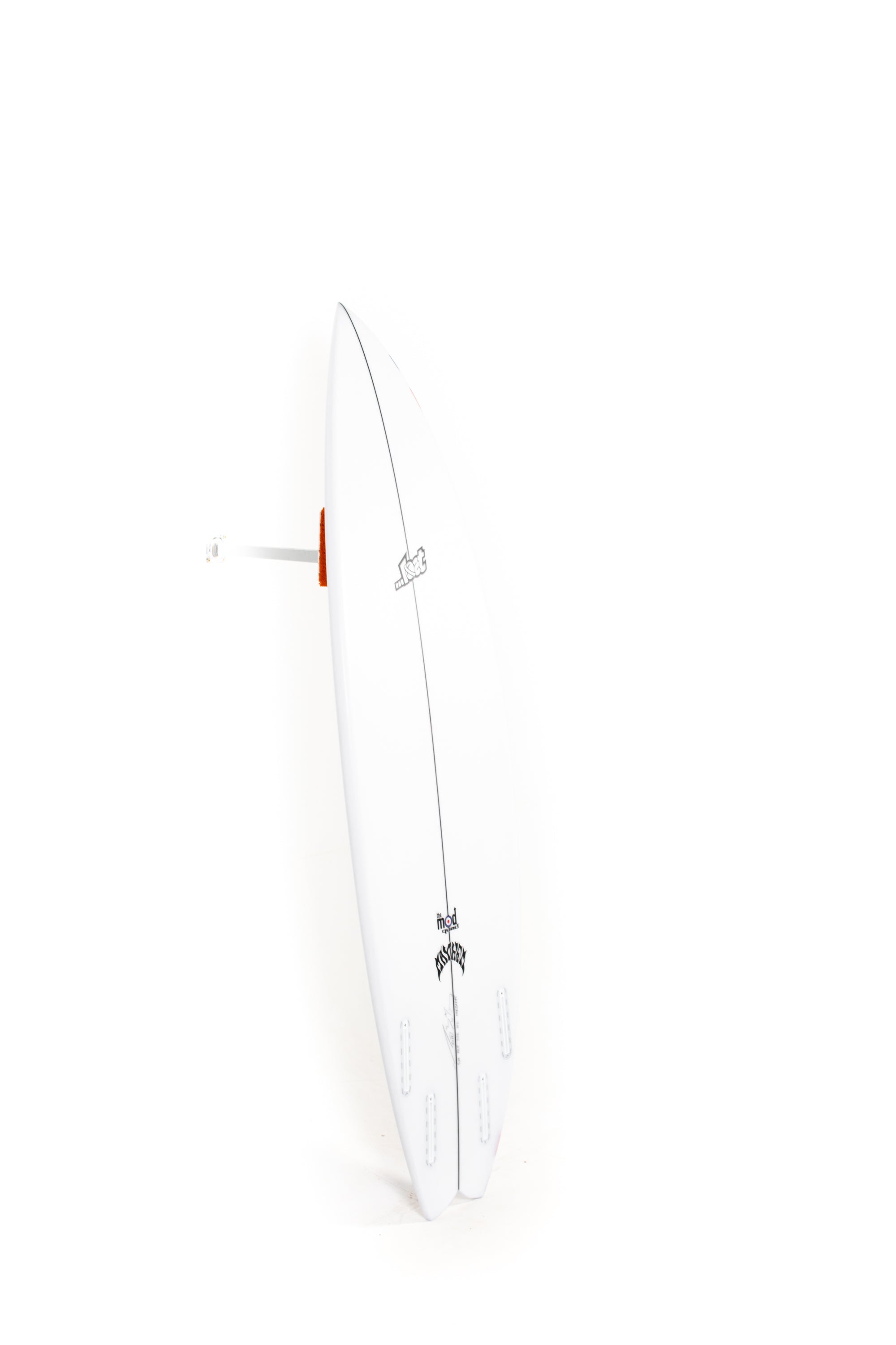 Lost's been building unique little hybrid quads for Shane Beschen and Pops Ho, over in Hawaii, for years now. They love ‘em in typical punchy hot dog days, on the NorthShore, but we never really had many requests or demand to elaborate on them. Starting with those boards, but with smaller, softer, California and East Coast surf in mind, Matt went to work. The Mod Quad has a low overall curve, with a fast entry and a drivey tail rocker. It features an almost exaggerated rail line rocker, that creates a deep single concave, between the feet and hyper-extends through the tail, ending in a noticeable Vee, behind the rear fin. Low rocker for speed, concave for lift, curvey rail line for turning and the Vee out the back, which acts like a rear fin, guiding and holding in through turns. A generally wide and skatey performance outline, with full, forgiving nose and a wide point set back, creates hip in the tail that swoops into a moderate swallow. The swallow reduces a bit of surface area, lends some grip and pivot, while still retaining width, for speed in smaller everyday surf.