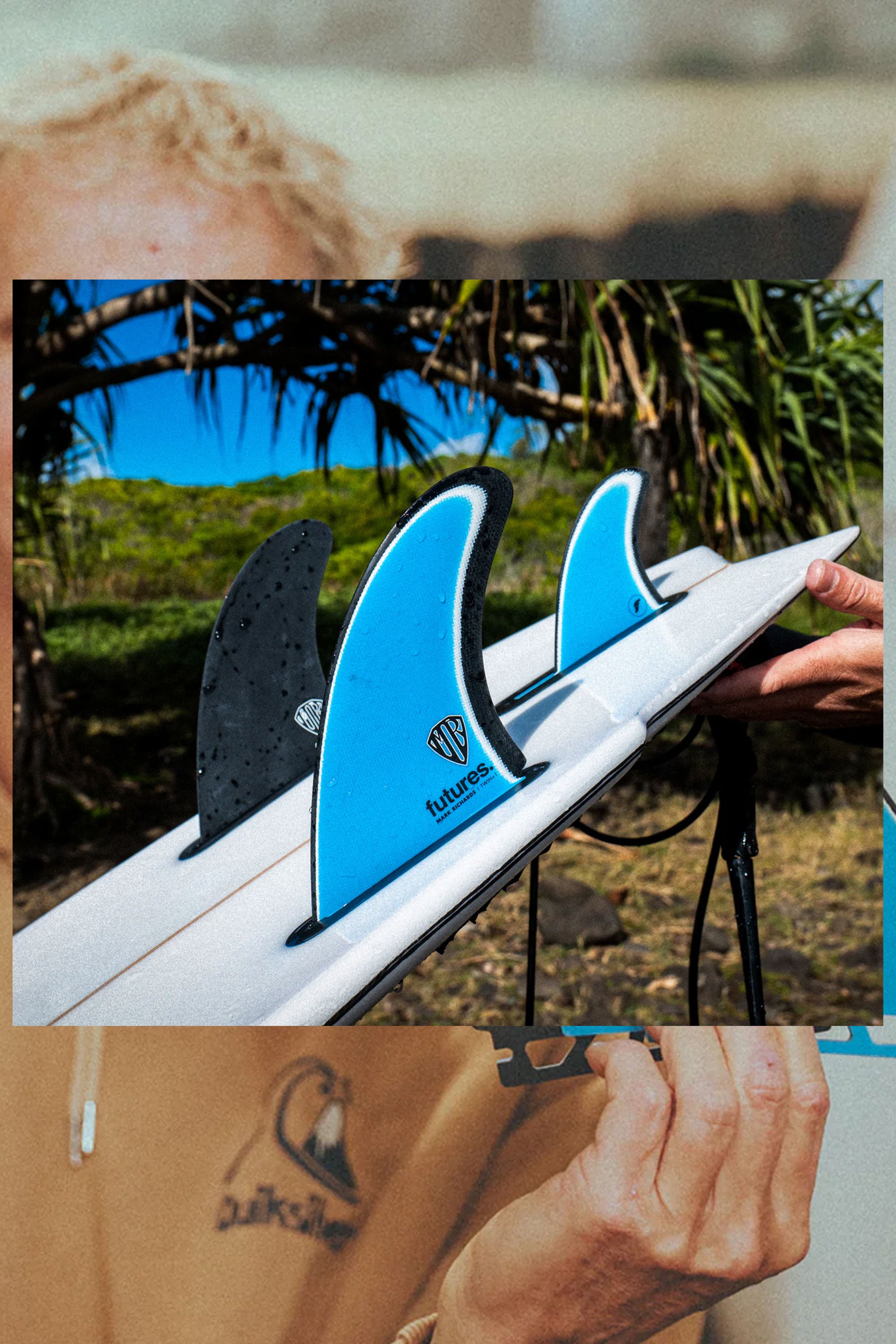 "Being pure foiled fiberglass, the construction of my Futures Fin set mirrors the traditional flex characteristics of a hand-foiled fin cut from a multi layered fiberglass fin panel. The 2+ 1 configuration gives the board a twin fin performance feel with additional speed and maneuverability. The small real rear stabilizer fin adds a degree of positive control and predictability. The outline temp for the MR Twin Fin set plus rear stabilizer is over 20 years old. I developed it around 2000 in response to a request from Soeda Surfboards Japan to make some twin fins for the team riders. My pure twin templates have a wide base and are very upright with not a lot of rake. So, I decided to design a new twin fin and small stabilizer template. Feedback from the Soeda team riders was positive, they loved the boards. The moment I got the feedback I got excited and shaped myself a modern twin fin with the 2+ 1 set-up. 24 years later I'm still surfing with these fins and totally frothing on them!!!"