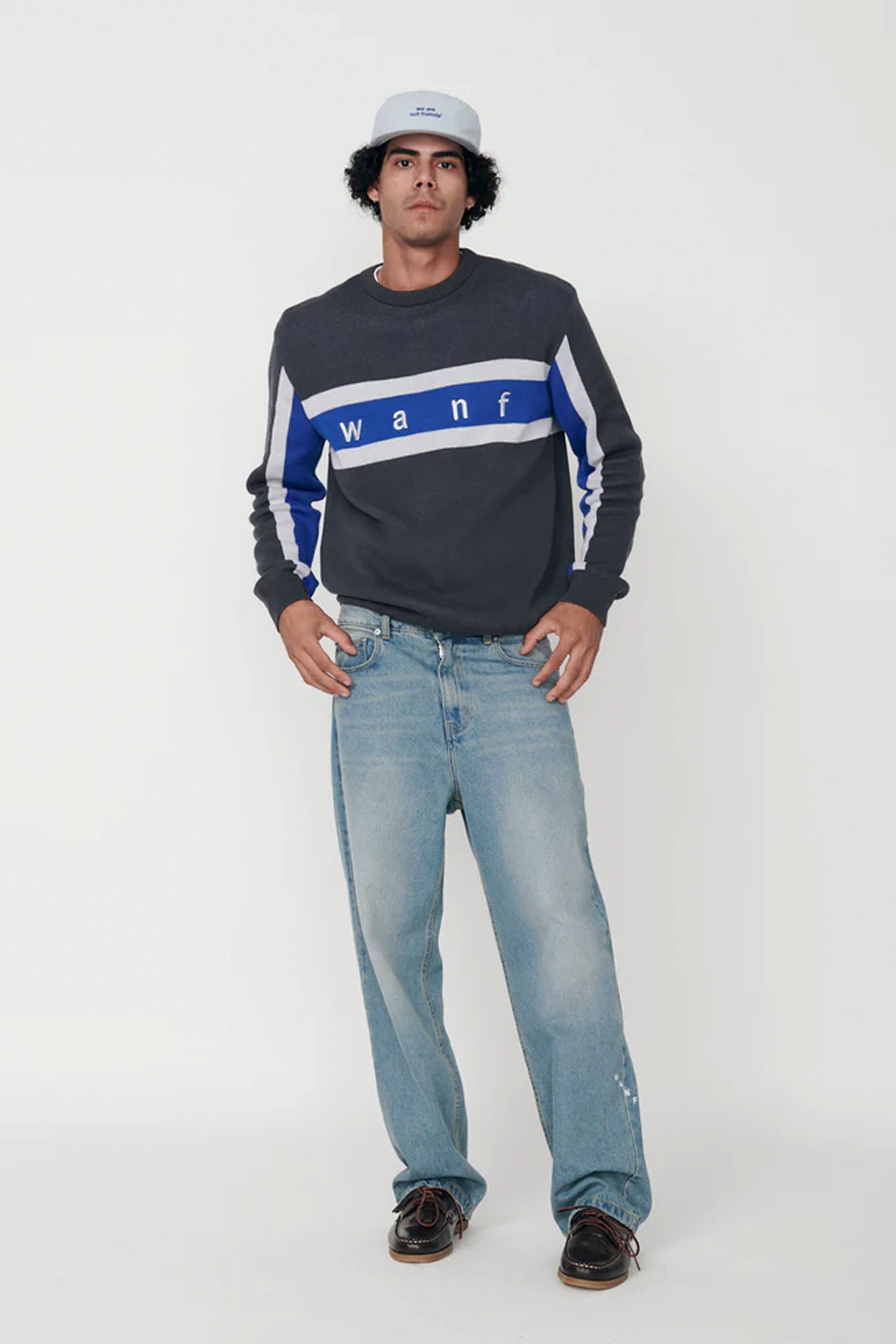 Stand out in this heavyweight organic cotton sweater—bold electric blue stripes on chest and sleeves inject attitude, while its rich black base keeps things clean and versatile. Ribbed cuffs and hem bring structure to its relaxed, street‑ready silhouette.