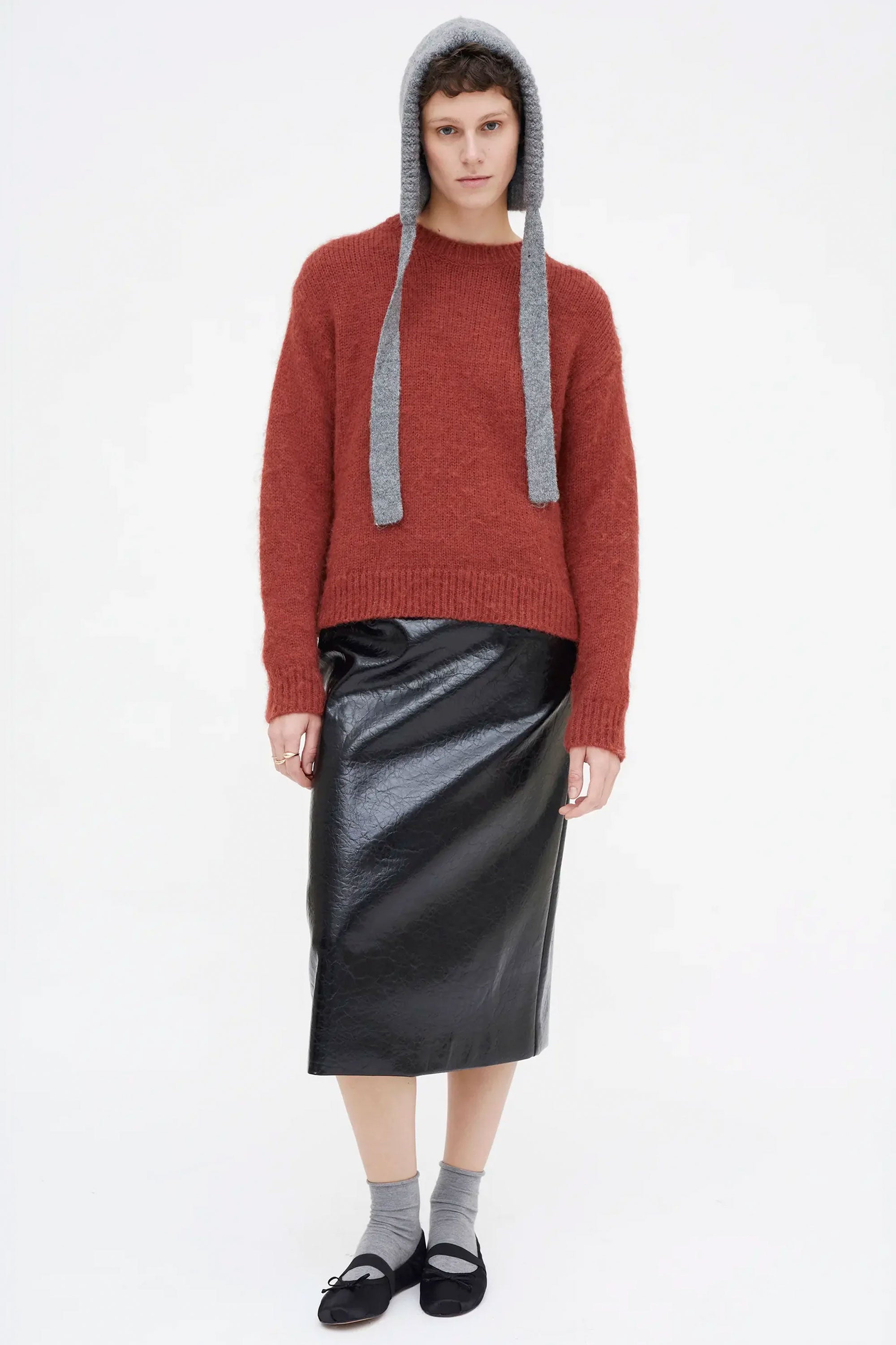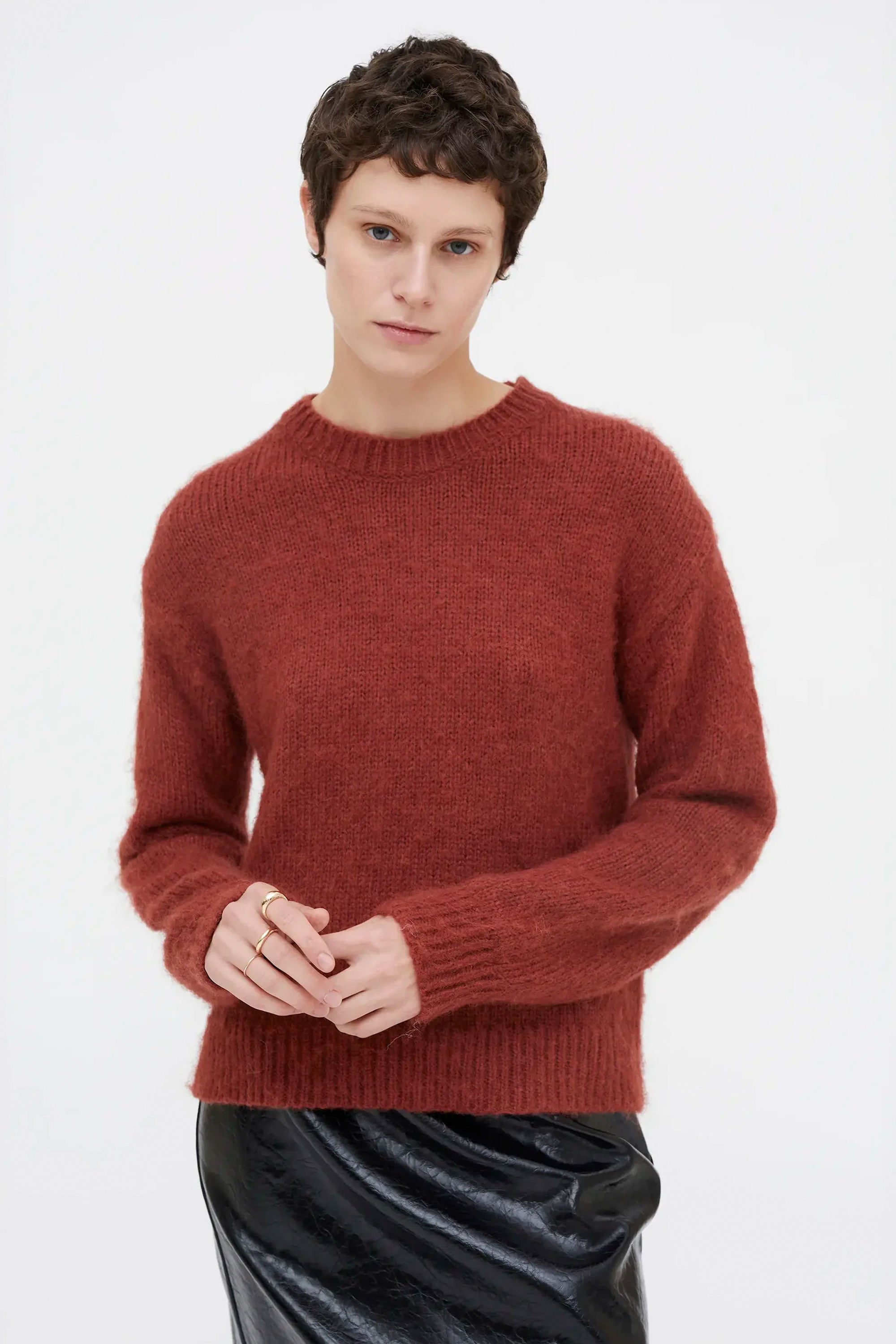 A relaxed long-sleeve crew sweater in warm brown, made from soft knit fabric with a subtle drape. Features dropped shoulders and a clean silhouette—perfect for layering through cool seasons.