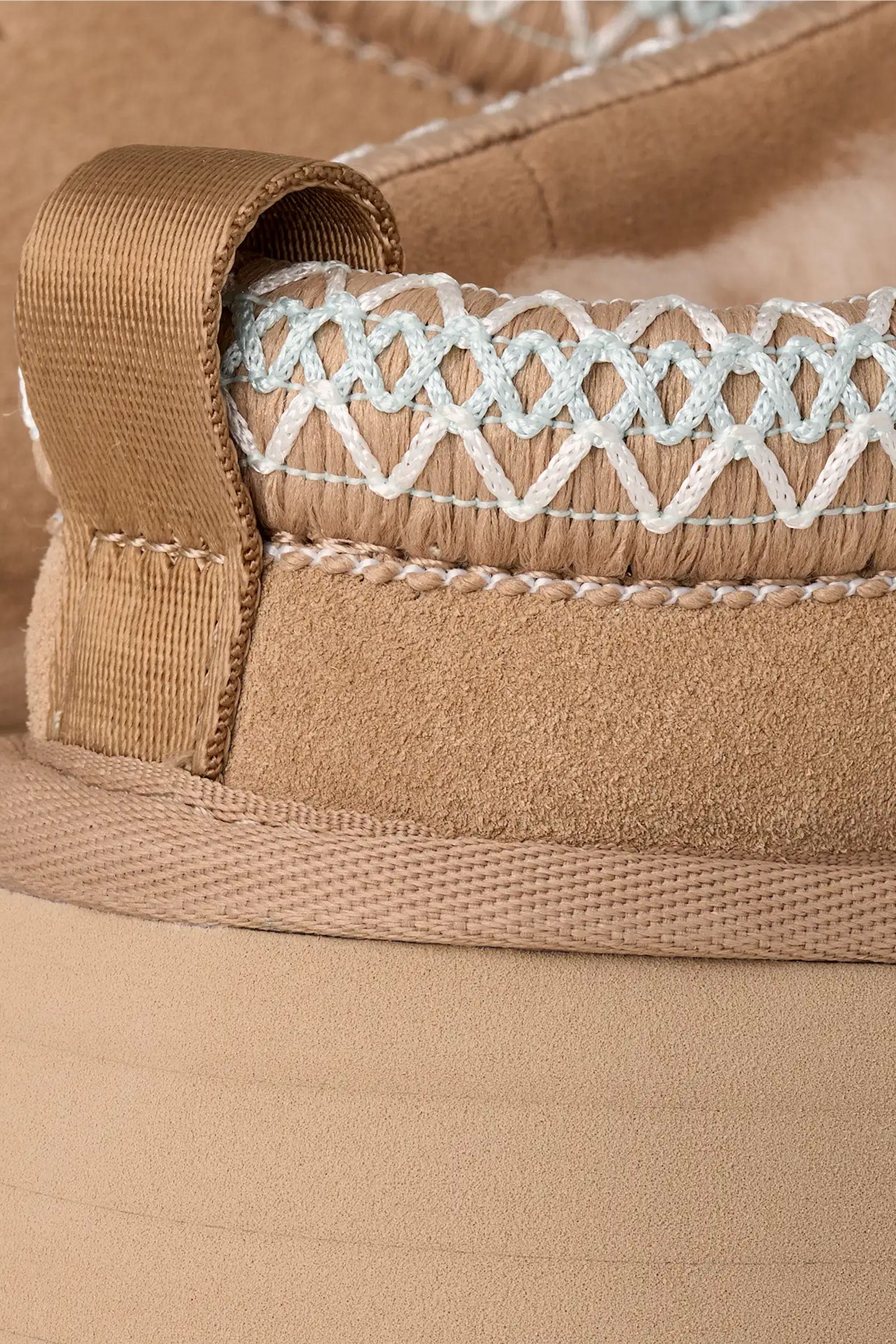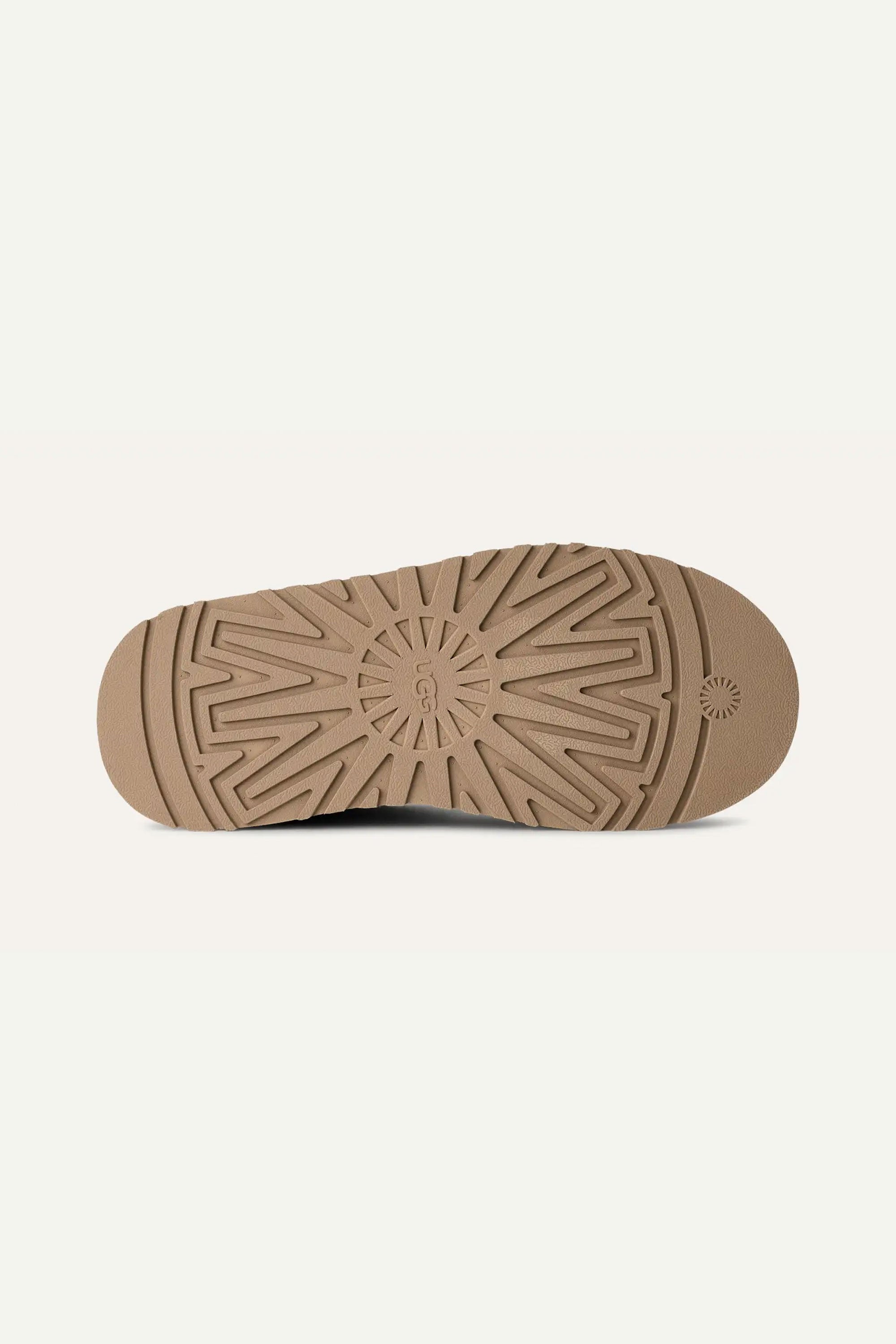 A refined slipper-style clog with soft suede upper and plush sheepskin lining that provides cozy warmth. A sugarcane EVA platform sole with rocker shape offers lightweight movement for indoor or relaxed outdoor wear. Subtle braided detailing around the rim adds a touch of artisan elegance.