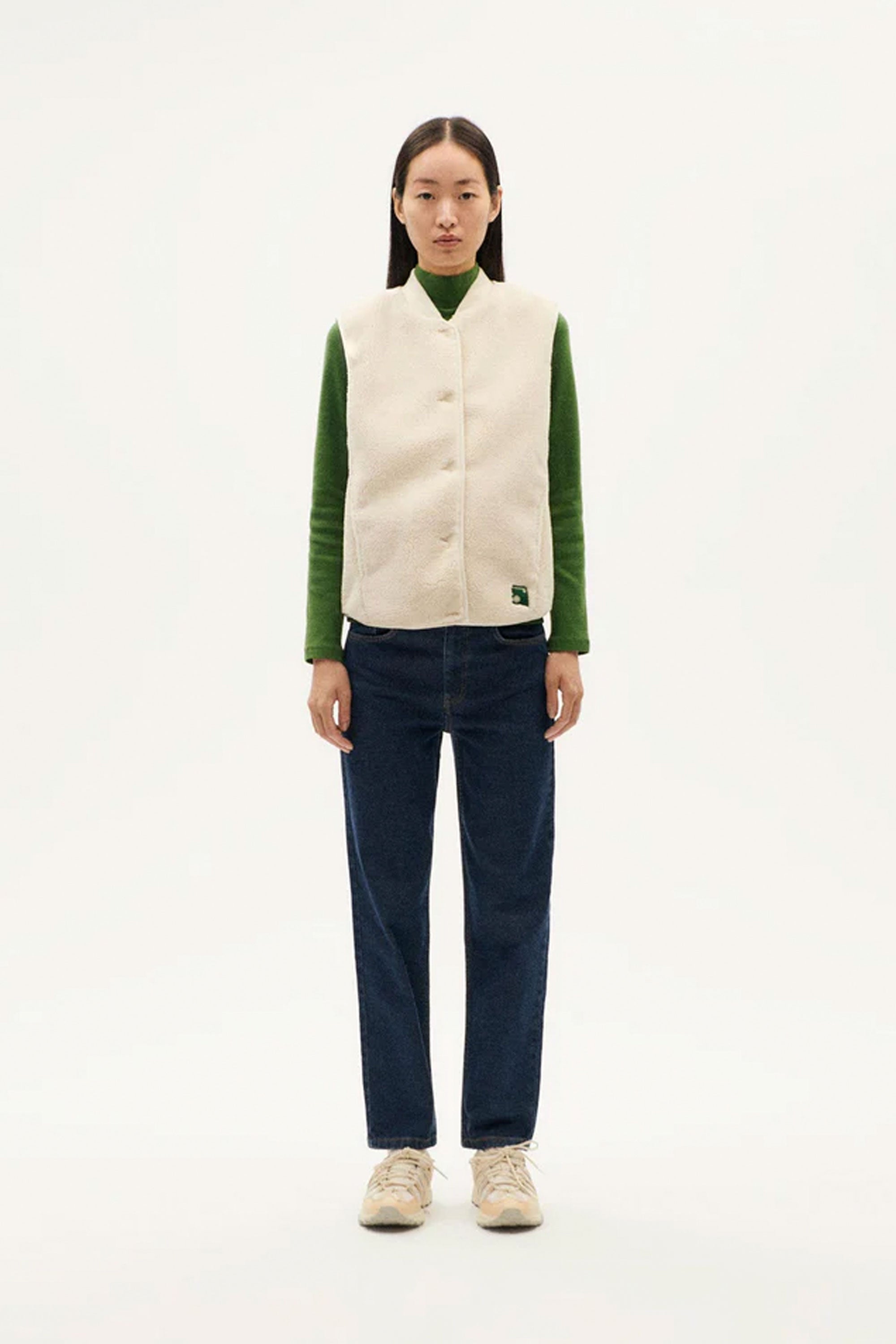 This thoughtful mid-layer, made with at least 50% recycled fibers and GRS-certified, features a warm high collar, front button closure, and a clean, minimalist silhouette. Its soft ivory fleece is garment-dyed and responsibly crafted, offering eco-conscious comfort you’ll reach for again and again.